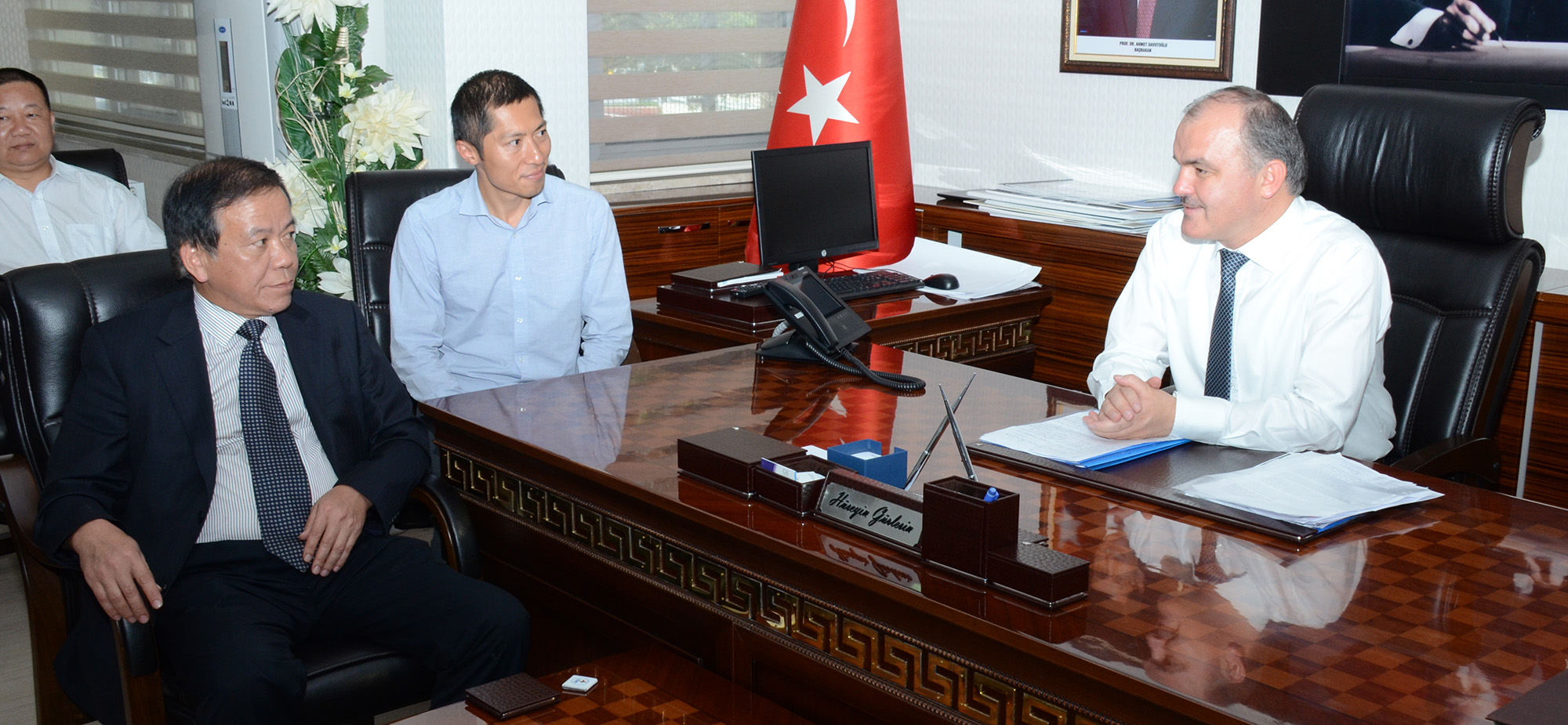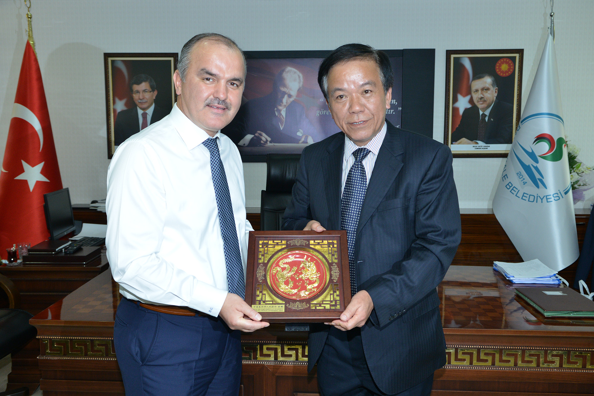Pamukkale Belediye Başkanı Hüseyin Gürlesin, Denizli’de konuk ettiği ve Pamukkale, Karahayıt ve Hierapolis’te ağırladığı Çin heyetini makamında da kabul etti. Burada yapılan görüşme samimi bir ortamda geçti. Quanzhou ile Denizli’nin benzerliklerinin olduğunu söyleyen Pamukkale Belediye Başkanı Hüseyin Gürlesin, “Çinli heyeti Pamukkale’de ağırlamaktan mutluluk duyduk. Bu tür ziyaretlerle iki ülke arasında olduğu gibi iki şehir arasında da diyaloglar kurulmuş oluyor. Quanzhou’nun Denizli ile mermer konusunda ticaret yapması çok önemli. Ouanzhou Türkiye’den yaklaşık 300 milyon dolarlık mermer alımı yapıyor. Bu ticaretin daha da artmasını diliyoruz. Dünyaca ünlü Pamukkale ve Karahayıt’ta Çinli konuklarla bir arada olmaktan da mutluluk duyduk. Pamukkale her geçen gün Dünya’da tanınmaya devam ediyor” dedi.