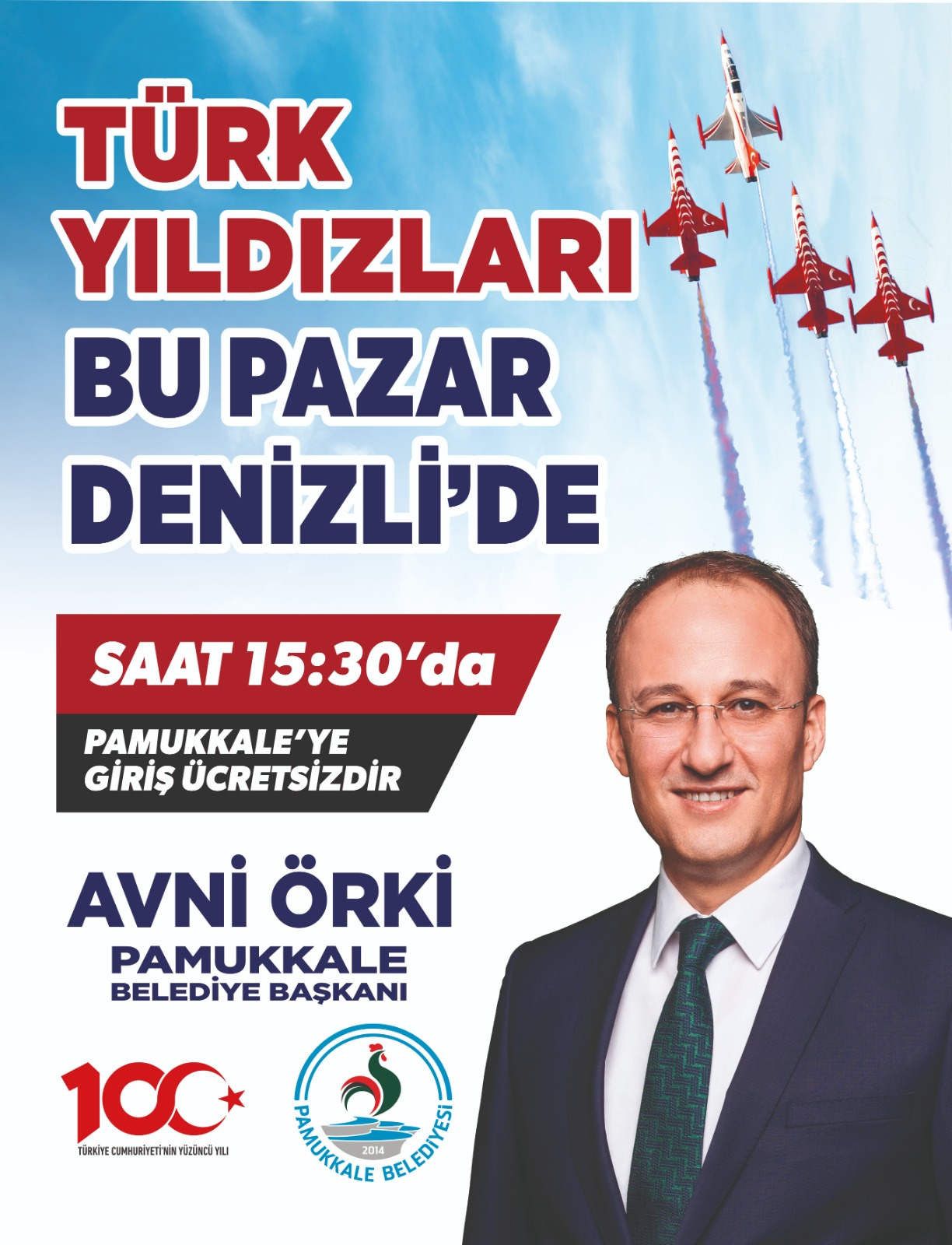 Pamukkale Belediyesi tarafından Cumhuriyetimizin 100.Yılı kutlama etkinlikleri kapsamında, Türk Yıldızları akrotim ekibi Pamukkale’ye geliyor. Pamukkale Belediye Başkanı Avni Örki, bu Pazar gerçekleşecek ve Pamukkale’ye girişlerin ücretsiz olduğu “Pamukkale Belediyesi Gençlik ve Havacılık Festivali”ne tüm vatandaşları davet etti.