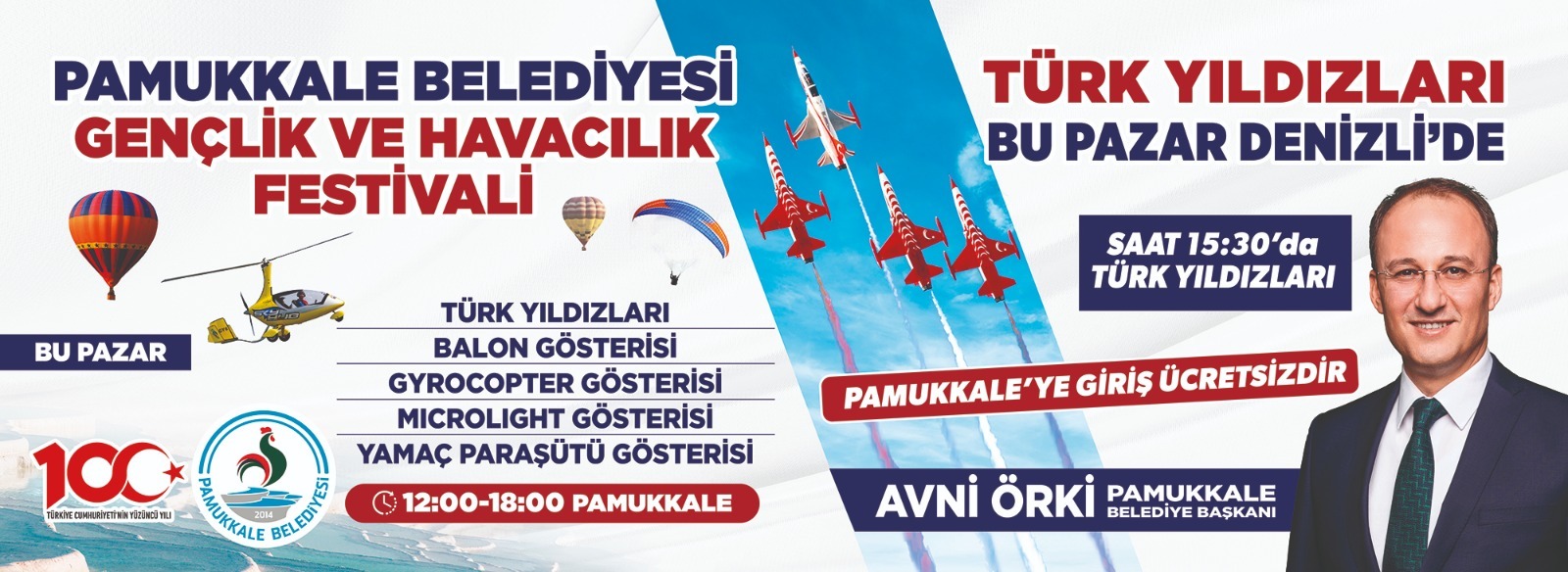 Pamukkale Belediye Başkanı Avni Örki, Cumhuriyetin 100.Yılı dolayısıyla 22 Ekim 2023 Pazar günü, “Pamukkale Belediyesi Gençlik ve Havacılık Festivali”ne ev sahipliği yapacaklarını belirtti. Balon, Gyrocopter, microlight ve yamaç paraşütü gösterilerinin olacağı etkinlikte, Türk Yıldızları akrotim ekibi gösterileri ile nefesleri kesecek. UNESCO Dünya Kültür Mirası listesinde yer alan Pamukkale Travertenlerinin güzelliğine güzellik katacak olan gösteriler süresince Pamukkale’ye girişler ücretsiz olacak. 22 Ekim 2023 Pazar günü saat 12:00 ila 18:00 saatleri arasında gerçekleşecek olan etkinliklerde, saat 15:30’da Türk Yıldızları Pamukkale semalarında olacak. Pamukkale Belediye Başkanı Avni Örki, “Cumhuriyetimizin 100.Yılı dolayısıyla Türk Yıldızları’mız Pamukkale’mize geliyor. Pamukkale Belediyesi olarak her zaman ilçemiz için en iyisini en güzelini arzu ediyoruz, Pamukkale için gözümüz her zaman yükseklerde. Bu Pazar da her birimiz gözümüzü yükseklerden alamayacağız. Birbirinden güzel gösterilerle Pamukkale semalarında Cumhuriyetimizin 100.Yılını kutlayacağız. Pamukkale’ye girişlerin de ücretsiz olduğu etkinliğimize tüm vatandaşlarımızı bekliyoruz” dedi.