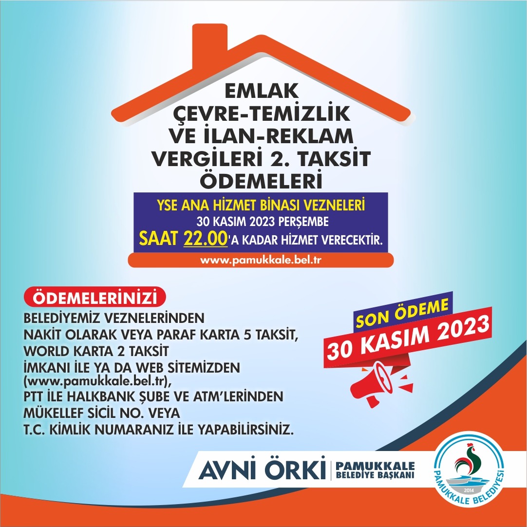 Pamukkale Belediyesi tarafından, Emlak, Çevre Temizlik, İlan Reklam vergilerinin 2023 yılı ikinci dönem ödemelerinin son gününün 30 Kasım 2023 olduğu hatırlatılarak, yaşanan yoğunluk nedeniyle bu tarihte YSE kavşağındaki belediye ana binası veznelerinin saat 22.00’ye kadar açık olacağı bildirildi.