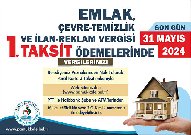 T.C. Pamukkale Belediyesi'nden yapılan açıklamada, Emlak, Çevre-Temizlik ve İlan-Reklam Vergisi birinci taksit ödemelerinin başladığı bildirildi. Son ödeme tarihinin ise 31 Mayıs 2024 günü olduğunu açıklandı.