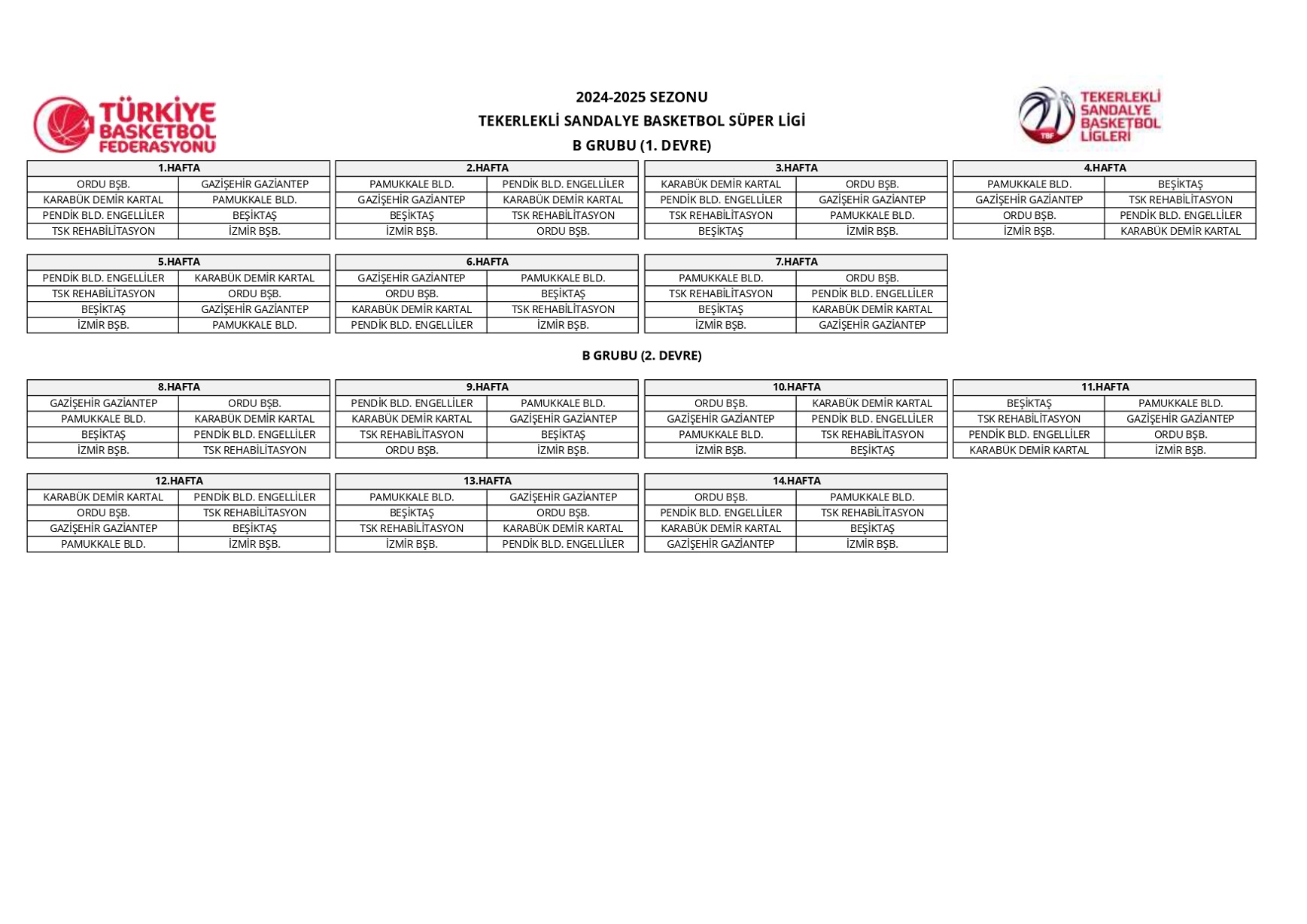 Tekerlekli Sandalye Basketbol Süper Ligi’nde 2024-2025 sezonunun fikstürü belirlendi. Bu sezon Süper Lig’de mücadele edecek Pamukkale Belediyespor Tekerlekli Sandalye Basketbol Takımı, kura çekimlerine göre B Grubu’nda yer alacak. 2 Kasım 2024 tarihinde başlayacak olan 2024-2025 sezonunda Pamukkale Belediyespor Tekerlekli Sandalye Basketbol Takımı, Beşiktaş, İzmir BŞB, Gazişehir Gaziantep, Ordu BŞB, Karabük Demir Kartal, Pendik Belediye SK, TSK Rehabilitasyon ile aynı grupta yer alacak. Normal sezonu 14 hafta sürecek olan Süper Lig maratonunda Pamukkale Belediyespor ilk maçını deplasmanda Karabük Demir Kartal ile oynayacak. Mavi beyazlı ekip ilk iç saha mücadelesinde ise Pendik BLD. Engelliler’i ağırlayacak.