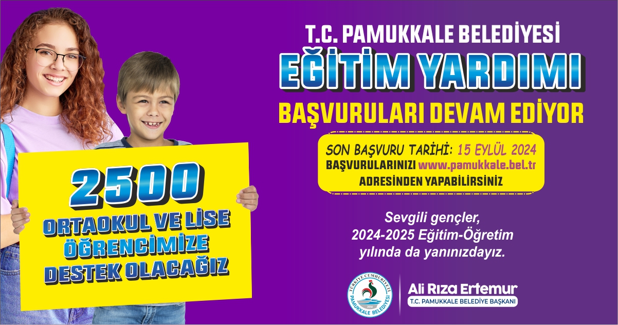 T.C. Pamukkale Belediyesi’nin 2024-2025 eğitim öğretim yılı içerisinde ortaokul ve lisede eğitim gören toplam 2 bin 500 öğrenciye 8 ay boyunca yapacağı, eğitim yardımlarının başvuruları devam ediyor. Vatandaşlar www.pamukkale.bel.tr adresinden 15 Eylül 2024 Pazar gününe kadar başvurularını yapabilecek.