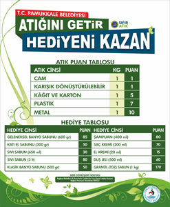 Vatandaşlarda atık toplama ve ayrıştırma bilincinin oluşturulması ve buna teşvik etmek amacıyla başlatılan proje kapsamında, geri dönüştürme için getirilen her materyal, puanlara dönüşecek ve karşılığında hediye ürünler verilecek. Proje kapsamında vatandaşların evlerinde ayrıştırdıkları geri dönüştürülebilen kağıt, cam, plastik, metal gibi atıkları “Pamukkale Belediyesi Geri Dönüşüm Noktası”na getirerek puan toplayarak hediye kazanacakları bir sistem oluşturuldu. Sistem üzerinde biriken puanlar karşılığında hediye ürün olarak sıvı el sabunu, katı el sabunu, şampuan, duş jeli, el kremi, toz deterjan(granül sabun) gibi kişisel bakım ürünleri verilecek.