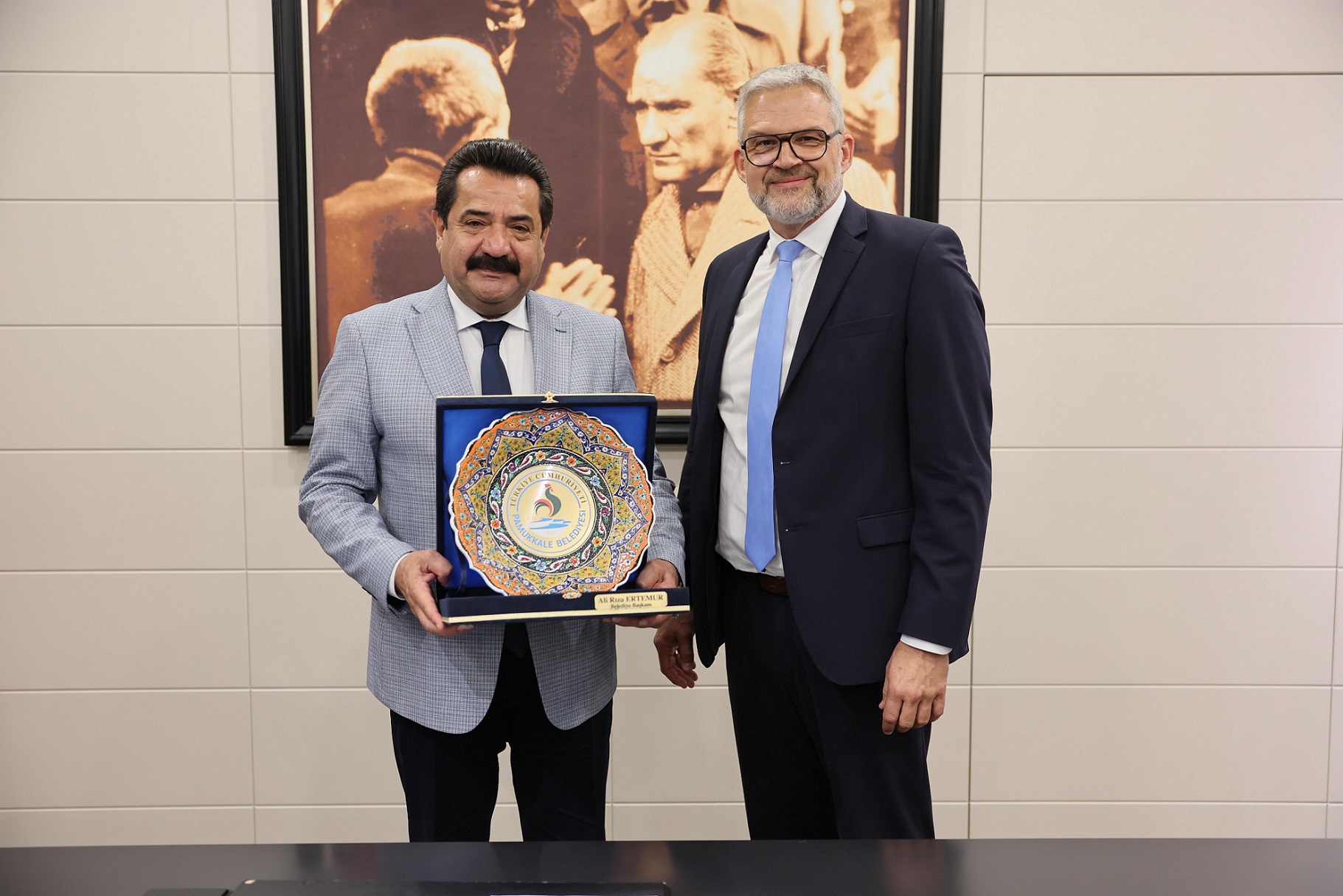 Pamukkale Belediye Başkanı Ali Rıza Ertemur, “Sizleri burada ağırlamaktan büyük mutluluk duyuyoruz. Kardeş şehir projemizle, Pamukkale’de yaşayan vatandaşlarımızla ve Neckarsulm’da yaşayan yurttaşlarımızla kardeş şehir olduğumuzu bir kez daha ispatlamış olduk. Bunlar gelişerek devam edecek. Öncelikle şehrinizde Türk yurttaşlarımızla Neckarsulm’da kardeşçe yaşadığınız için teşekkür ediyoruz. İnanıyorum ki bundan sonraki ilişkilerimiz daha güçlü olacak. Umarım bu başlangıç, verimli projelere ve etkinliklere vesile olur, kardeş şehir ilişkimiz daha da güçlenerek devam eder” dedi. Neckarsulm Belediye Başkanı Steffen Hartwig, “Heyetimle birlikte Pamukkale gibi etkileyici bir şehirde misafir olmaktan büyük onur ve mutluluk duyuyorum. İlk andan itibaren bizlere gösterdiğiniz sıcak karşılama ve misafirperverlik için teşekkür ederiz. Pamukkale, doğal güzellikleri ve zengin tarihi ile dünya çapında tanınmakta. Buraya sadece güzellikleri görmek için değil, dostluk ve karşılıklı öğrenmeye dayalı güçlü bir iş birliği başlatmak için bulunuyoruz. Umudumuz, bu ilişkinin verimli ve uzun vadeli bir dostluğun temeli olmasıdır” diye konuştu.
