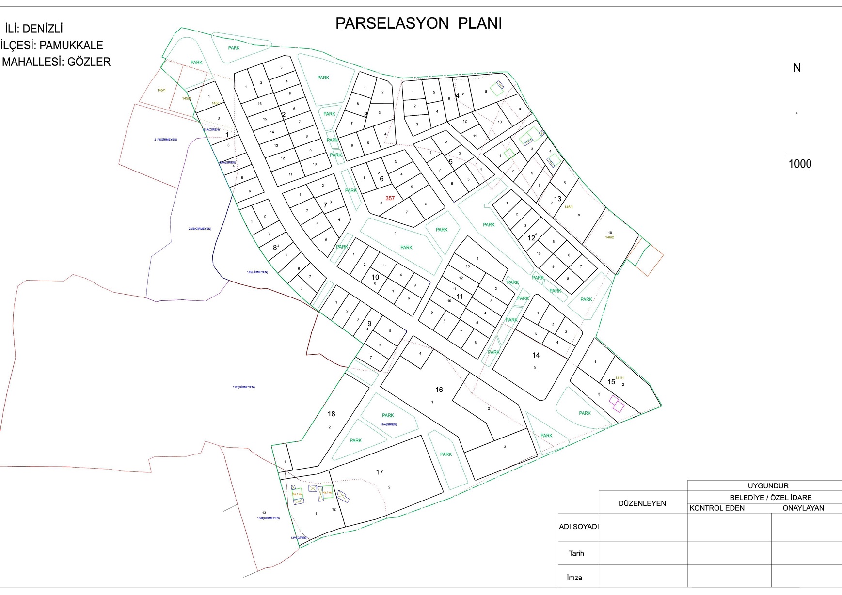 Tapunun Denizli İli Pamukkale İlçesi Gözler Mahallesi 141 ada 1 nolu parsel, 145 ada 1, 2 ve 3 nolu parseller, 146 ada 1 ve 2 nolu parseller, 356 ada 1 nolu parsel, 357 ada 1, 2, 3, 4, 5, 6, 7, 8, 9, 10, 11, 12, 13, 21 ve 22 nolu parsellerin bulunduğu alanda Arsa ve Arazi Düzenlemeleri Yönetmeliğinin 10. Maddesine göre düzenleme sınırının geçirilmesi, aynı yönetmeliğin 25. Maddesine göre ada dağıtımların ve parselasyon planın onaylanıp askıya çıkartılması için 09/07/2025 tarih 467 sayılı Pamukkale Belediyesi'nin encümen kararı ile kabul edilmiş, 5216 sayılı Büyük Şehir Belediye Kanunu'nun 7 nci maddesinin (b) bendine göre, Denizli Büyük Şehir Belediyesi'nin 21/08/2025 tarih 1880 sayılı encümen kararı ile onaylanmıştır. Parselasyon planları aynı kanunun 19. maddesine istinaden Belediyemiz İmar ve Şehircilik Müdürlüğünün ilan panosunda 29/09/2025 tarihinde askıya çıkartılacak olup, 30/10/2025 tarihinde askıdan indirilecektir. Bir aylık askı müddeti içinde bu imar uygulamasına karşı Belediye Başkanlığına itiraz edilebilir. 7201 sayılı Tebligat Kanununun 28. maddesine istinaden sahip ve ilgililere tebliğ olunur.
