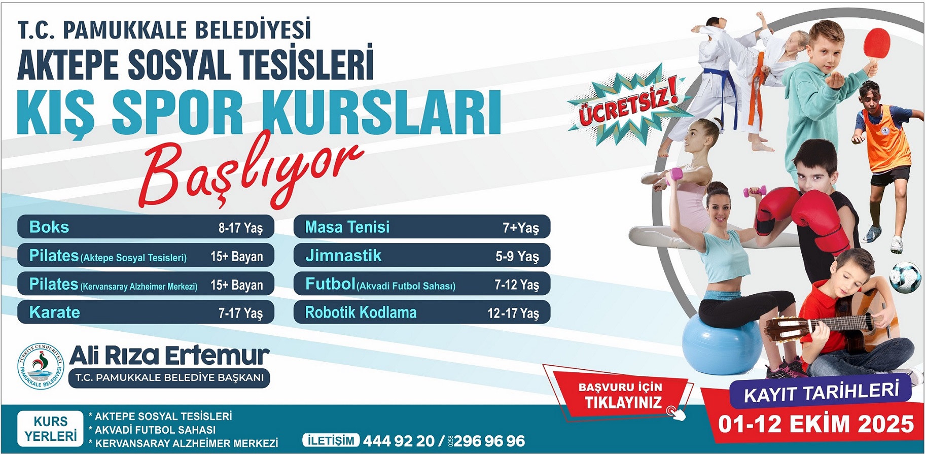 Kış Spor Kursları'na kayıt yaptırmak isteyen vatandaşlarımız, 01-12 Ekim 2025 tarihleri arasında Pamukkale Belediyesi’nin resmi internet sitesi olan www.pamukkale.bel.tr adresi üzerinden gerçekleştiriliyor. Detaylı bilgiye 444 92 20 veya 0258 296 96 96 numaralı telefonlar ulaşılabilir.