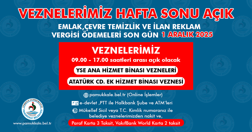 T.C. Pamukkale Belediyesi, Emlak, Çevre Temizlik ve İlan Reklam Vergisi’nin ikinci taksit ödemeleri için mükellefleri uyardı. Son ödeme tarihi 1 Aralık 2025 Pazartesi olarak belirlenirken, vatandaşların yaşanan yoğunluk nedeniyle mağdur olmaması için Pamukkale Belediyesi, veznelerin hafta sonu da açık olacağını duyurdu.