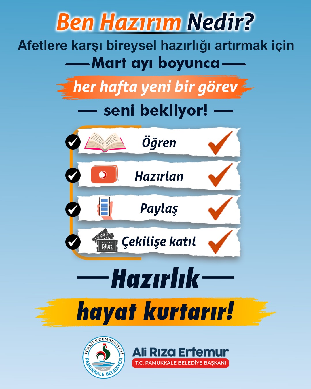 Pamukkale Belediye Başkanı Ali Rıza Ertemur, projenin amacının sadece bilgilendirmek değil, hazırlığı bir davranış biçimi haline getirmek olduğunu vurgulayarak; bilinçlenmenin hiç bu kadar heyecan verici olmadığını belirterek, “Afetlerin ne zaman geleceğini bilemeyiz ama hazırlıklı olmayı seçebiliriz. Afetlere karşı farkındalık kazandırmayı hedefleyerek başlattığımız projemiz dört hafta sürecek ve ilk görev bu hafta başladı. Tüm hemşehrilerimizi Mart ayı boyunca sürecek bu seferberliğe katılmaya ve 'Ben Hazırım' demeye davet ediyorum” dedi.