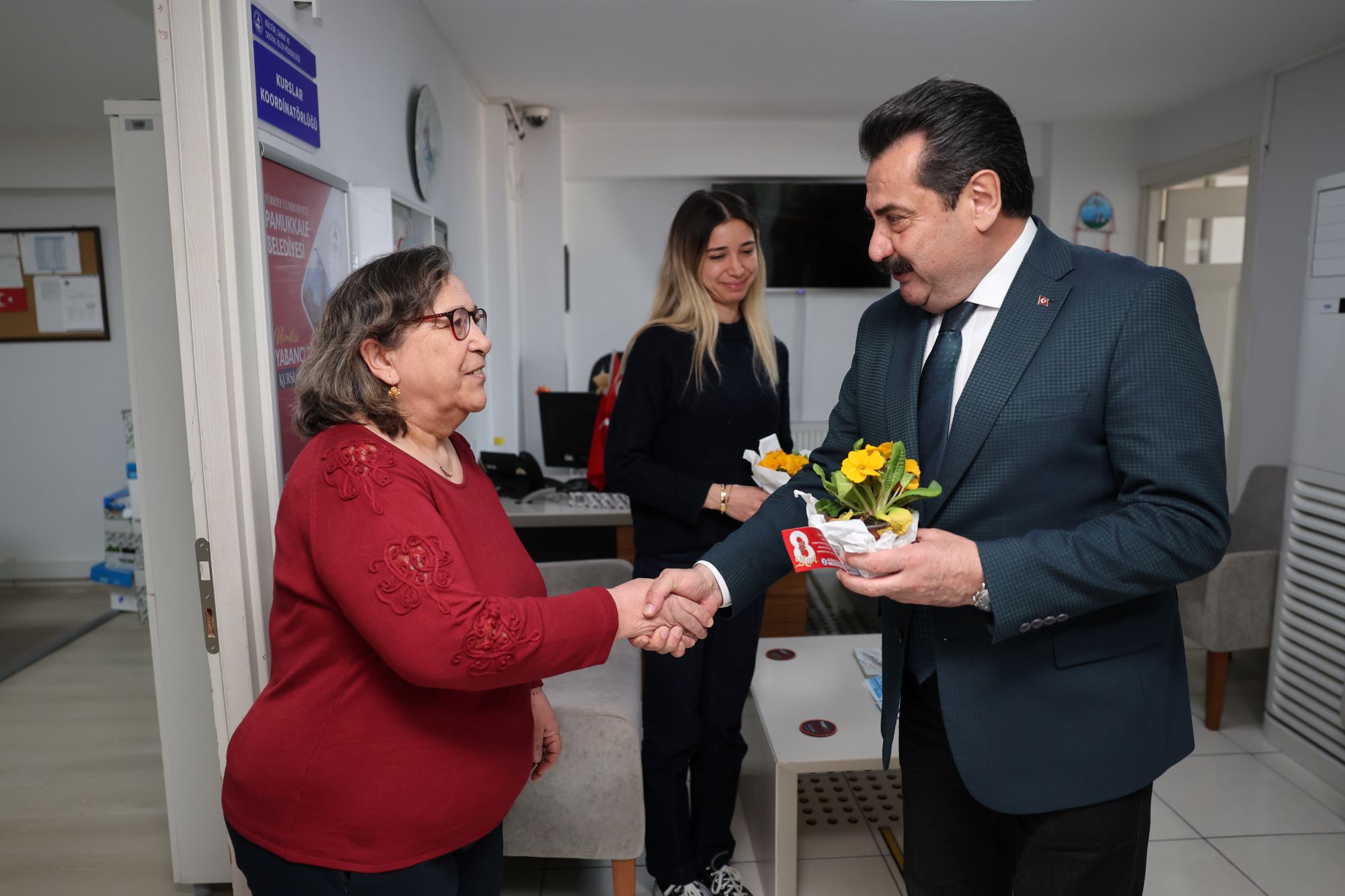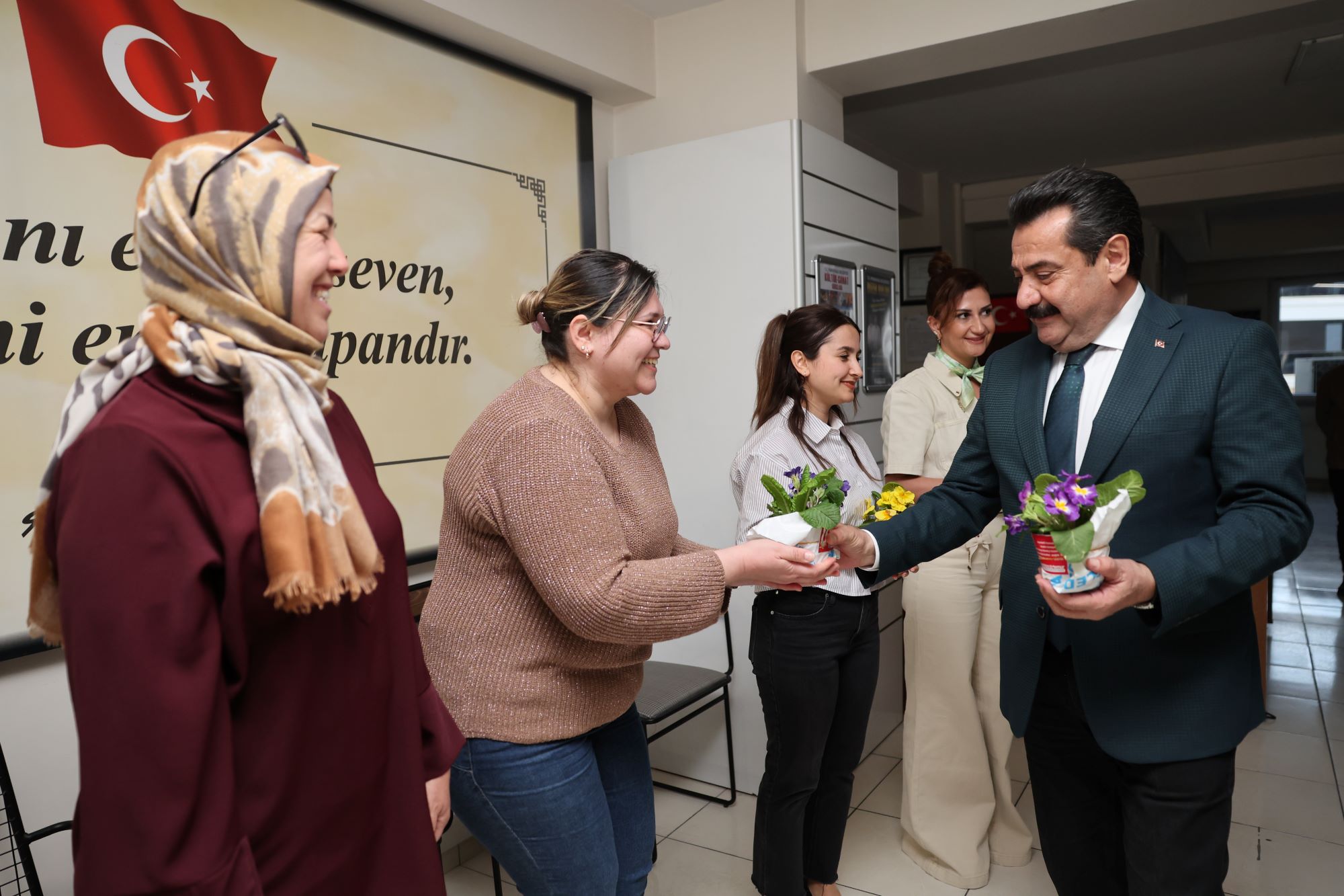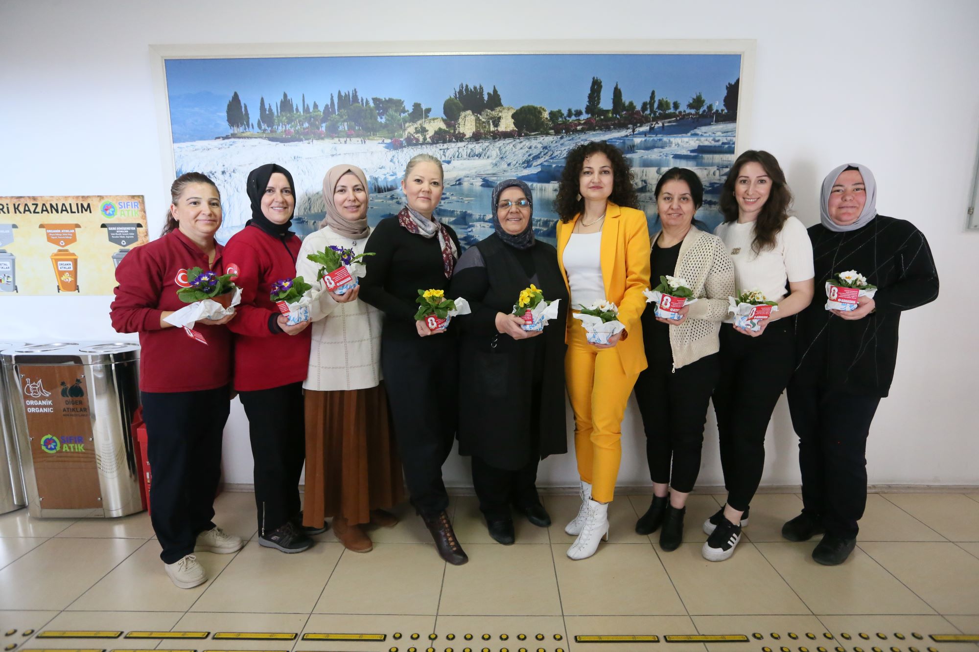 Törenin ardından programını sürdüren Pamukkale Belediye Başkanı Ali Rıza Ertemur, sadece üretim merkezinde değil, belediyenin tüm birimlerinde görev yapan kadın çalışanları da ziyaret etti. Her bir kadın personelin 8 Mart Dünya Kadınlar Günü’nü tek tek kutlayan Başkan Ertemur, Fidan Üretim Merkezi’nde yetişen çiçekleri takdim ederek özverili çalışmalarından dolayı teşekkürlerini iletti.