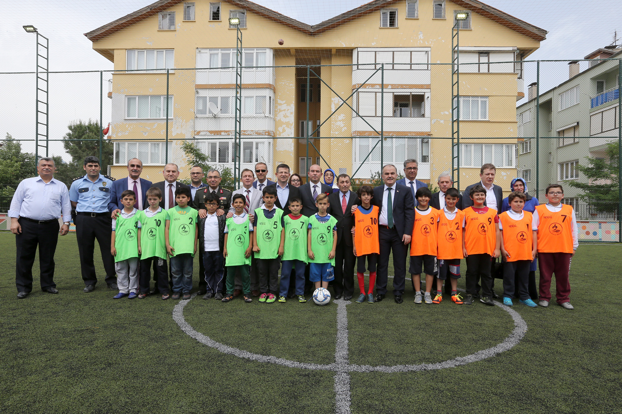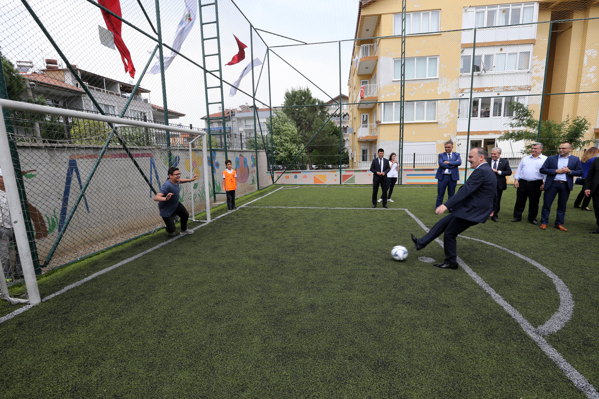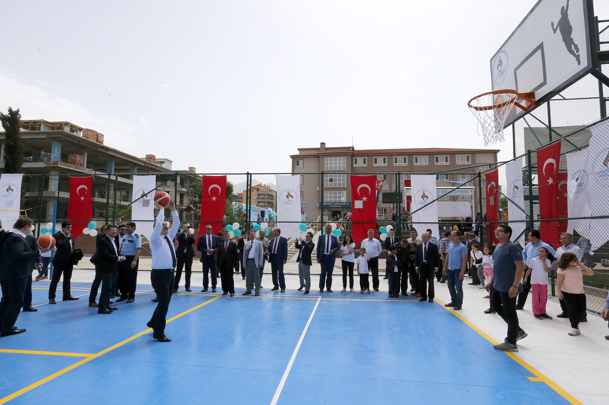 Başkan Gürlesin, protokol üyeleri, vatandaşlarla spor kompleksini gezerek, ortaya çıkan eseri inceledi. Başkan Gürlesin, öğrencilerle hem halı sahada top oynadı, hem basket atarak onların heyecan ve mutluklarına da ortak oldu.