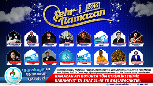 Pamukkale Belediyesi’nin “Karahayıt’ta Ramazan Geceleri” adıyla organize ettiği etkinlik için bir çok ünlü isim Denizli’ye gelecek. Ramazan ayının 3. Gününe denk gelen 8 Haziran Çarşamba günü ilk etkinlik gerçekleşecek. “Meddah-ı Fakir Yusuf Duru ile Ramazan Geceleri” programın olduğu her akşam çocukları eğlendirirken ilk gün Tasavvuf müziği konseri ile birlikte Sema Gösterisi düzenlenecek. 9 Haziran’da ise ezgi sanatçısı Fatih Koşan sahne alırken, 10 Haziran Cuma akşamı Eşref Ziya Terzi Pamukkaleliler ile bir araya gelecek. Haftanın son etkinliği ise 11 Haziran akşamı Grup Genç konseri olacak. Ramazan ayının ikinci haftasının ilk etkinliği 15 Haziran Çarşamba günü Recep Demirkaynak’ın stand-up gösterisi olacak. 16 Haziran Perşembe günü sohbet programı yer alırken, 17 Haziran’da ise ilahi sanatçısı Abdurrahman Önül vatandaşlarla bir araya gelecek. İkinci haftanın son etkinlik gününde ise 18 Haziran Cumartesi akşamı Aykut Kuşkaya sahne alacak.