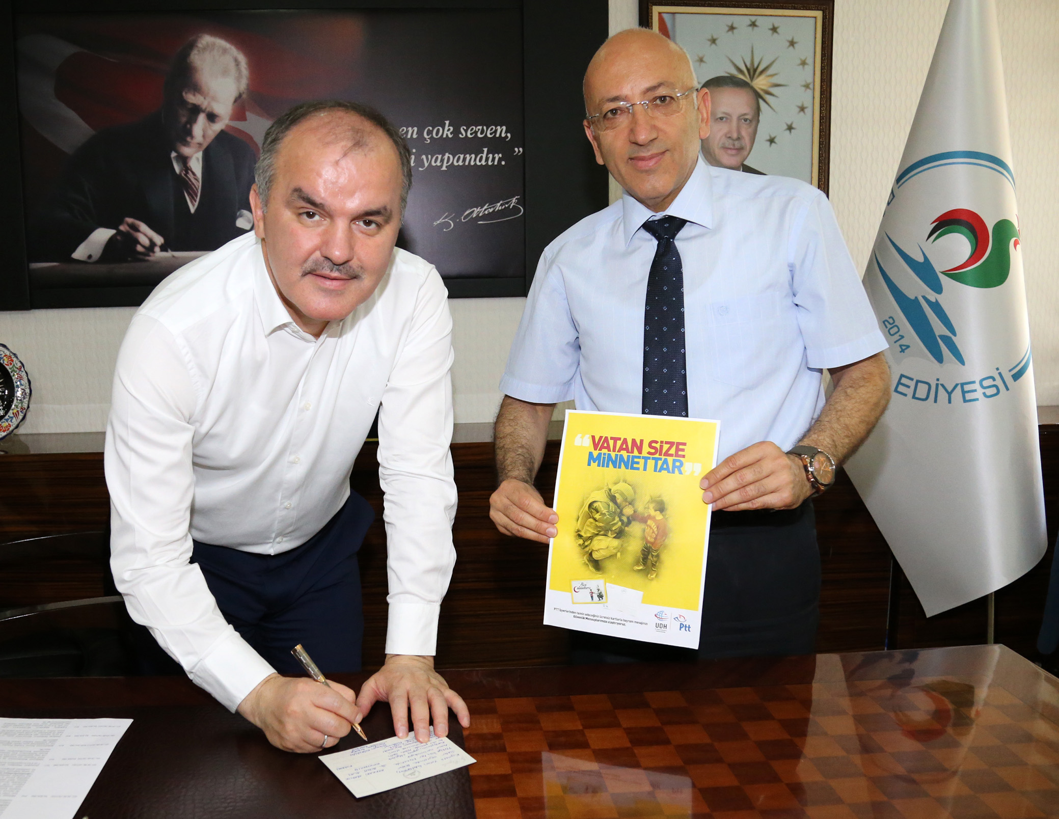 Pamukkale Belediye Başkanı Hüseyin Gürlesin’i kampanya dahilinde ziyaret eden PTT Denizli Başmüdürü Zekai Özkan, Türkiye genelinde "Vatan Size Minnettar" sloganıyla güvenlik güçlerine moral amaçlı başlatılan bayram tebrik kartı uygulaması hakkında bilgiler verdi. Başkan Gürlesin’de, kaleme aldığı tebrik kartını Hakkari Derecik 34. Hudut Alay Komutanlığı’nda görev yapan askerlere gönderilmesi amacıyla PTT Denizli Başmüdürü Özkan’a teslim etti. Başkan Gürlesin, tüm vatandaşları da kampanyaya davet ederek, ücretsiz olarak gönderebilecekleri bayram tebrik kartlarına duygularını yazarak güvenlik güçlerine göndermesini istedi. Vatan, millet savunmasında gözlerini kırpmadan canlarını ortaya koyan, vatanın huzur içinde olmasını sağlayan güvenlik güçlerinin hakkının ödenemeyeceğini vurgulayan Başkan Gürlesin, kampanyanın önemine vurgu yaptı, PTT’ye teşekkür etti.
