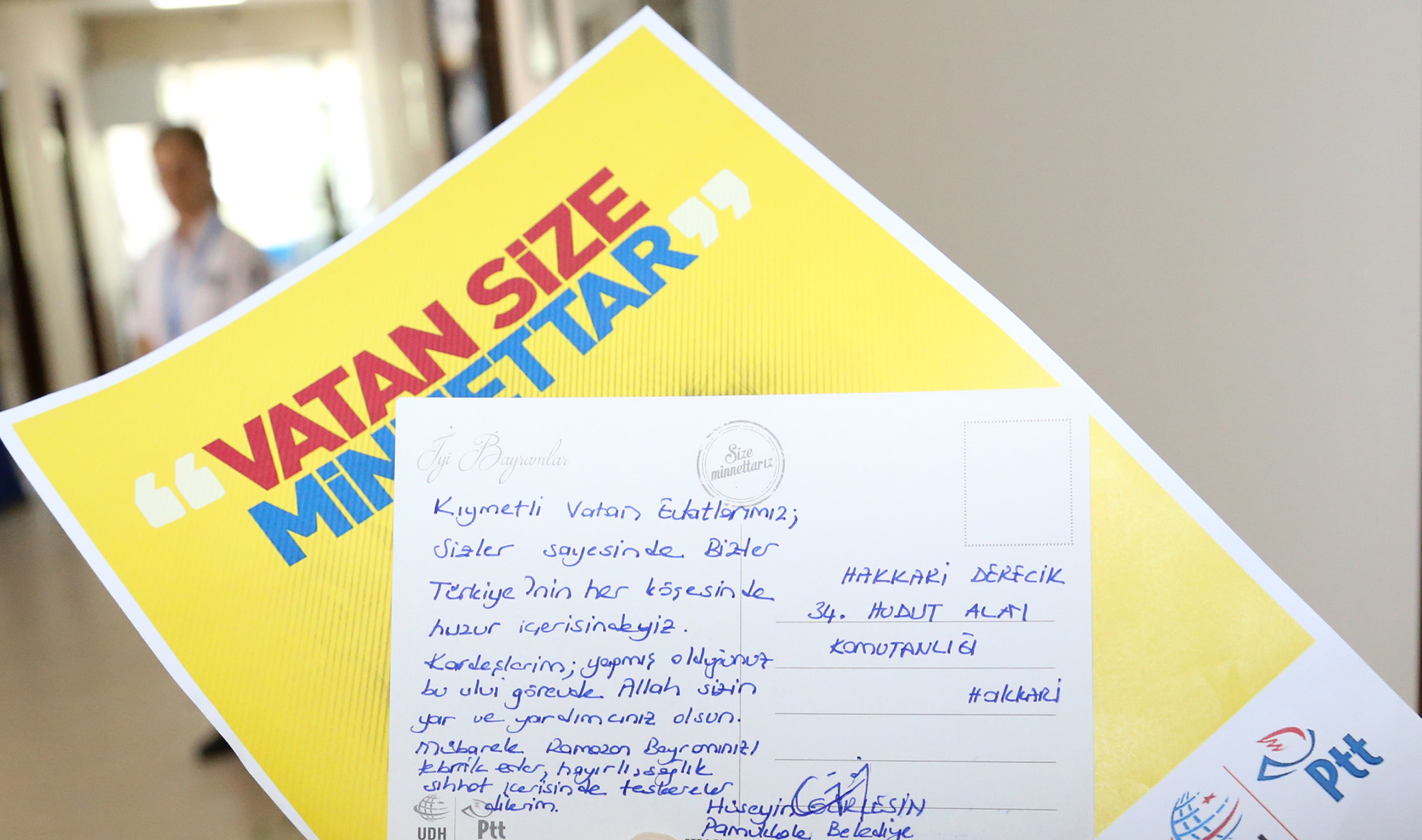 PTT Genel Müdürlüğü’nün Türkiye genelinde "Vatan Size Minnettar" sloganıyla güvenlik güçlerine moral amaçlı başlatılan bayram tebrik kartı uygulaması devam ediyor. Herkesin PTT şubelerinden ücretsiz olarak gönderilebileceği bayram tebrik kartı ile güvenlik güçlerine büyük moral ve destek veriliyor. Milli birlik beraberlik, hoşgörü ve kardeşlik duygularına katkıda bulunmak amacıyla Doğu ve Güneydoğu illerindeki karakollar ağırlıklı olmak üzere Türkiye'nin çeşitli illerinde toplam 127 karakolda görev yapan güvenlik güçlerine vatandaşlar ücretsiz olarak Ramazan Bayramına kadar tebrik kartı gönderebiliyor. Pamukkale Belediye Başkanı Hüseyin Gürlesin’de kampanyada yer alarak Hakkari Derecik 34. Hudut Alay Komutanlığı’na kaleme aldığı tebrik kartını gönderdi. Ayrıca Pamukkale Belediye Meclis Üyeleri ve belediye personeli de kampanya kapsamında çeşitli illerde görev yapan güvenlik güçlerine bayram tebrik kartı yolladı.