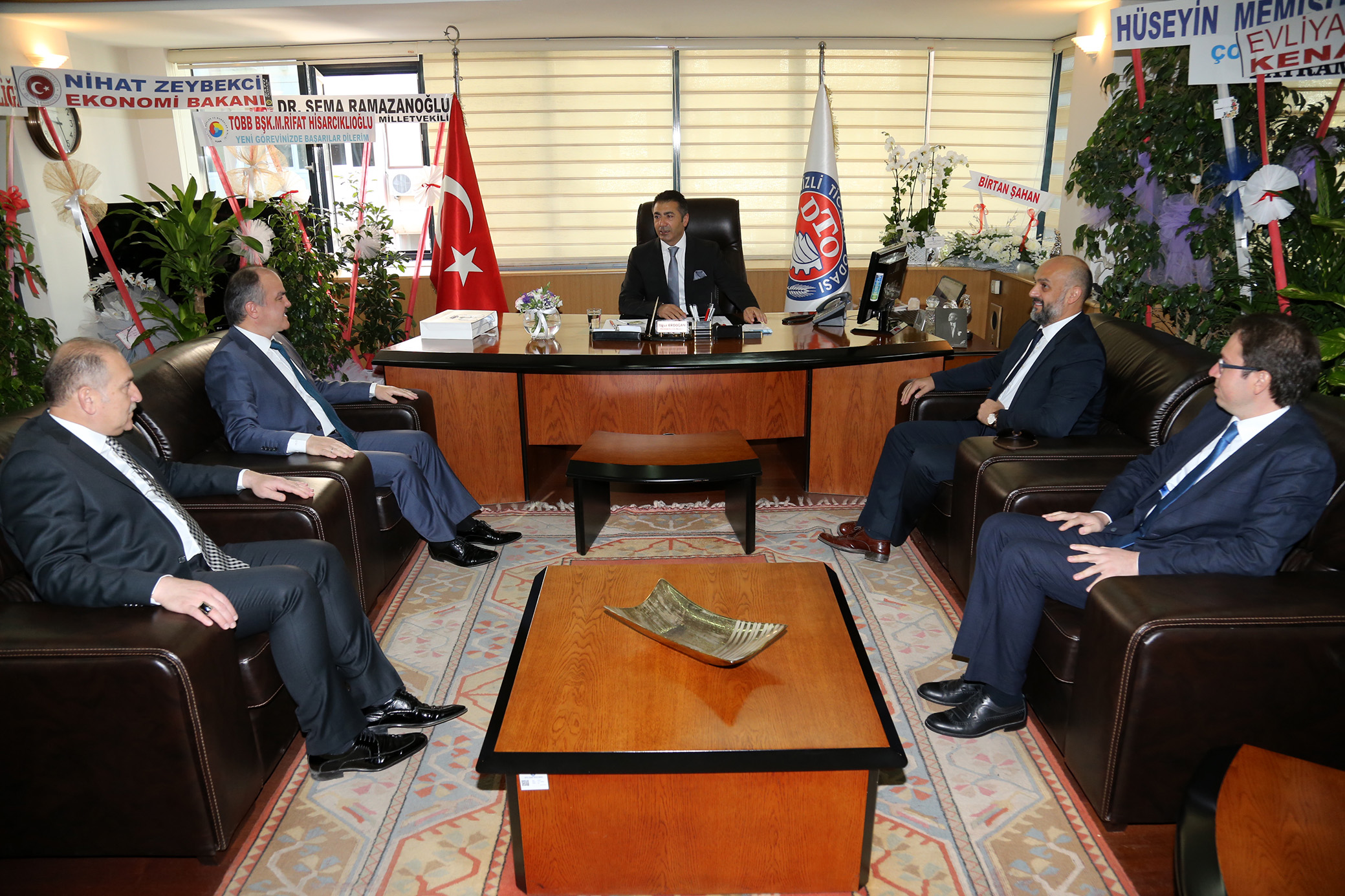 Denizli Ticaret Odası’nda yapılan seçimle Denizli Ticaret Odası Başkanlığı görevine Uğur Erdoğan seçildi. Pamukkale Belediye Başkanı Hüseyin Gürlesin; Pamukkale Belediye Başkan Yardımcıları Selim Arkan, Adnan Kaya ve Pamukkale Belediye Meclisi AK Parti Grup Başkanvekili Mehmet Ali Haluk Değirmenci ile birlikte DTO Başkanı Uğur Erdoğan’a hayırlı olsun ziyaretinde bulundu. Erdoğan, Başkan Gürlesin’i makamında ağırlayarak, ziyaretten duyduğu memnuniyeti dile getirdi. Erdoğan, görevleri süresince Denizli’nin her meslek dalına ve ekonomisine katkı koymak için çalışacaklarını vurguladı. Erdoğan’a görevinde başarı dileyen Başkan Gürlesin ise, “Göreviniz hayırlı olsun. Denizli Ticaret Odamız, Denizli ekonomisine, esnafına, ticari hayatına yön veren önemli bir kurum. Görevinizde inşallah başarıdan başarıya koşarsınız. Denizli Ticaret Odamıza, Denizli’mize hayırlı olsun” dedi.