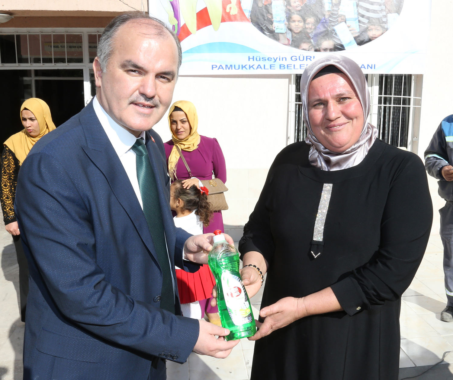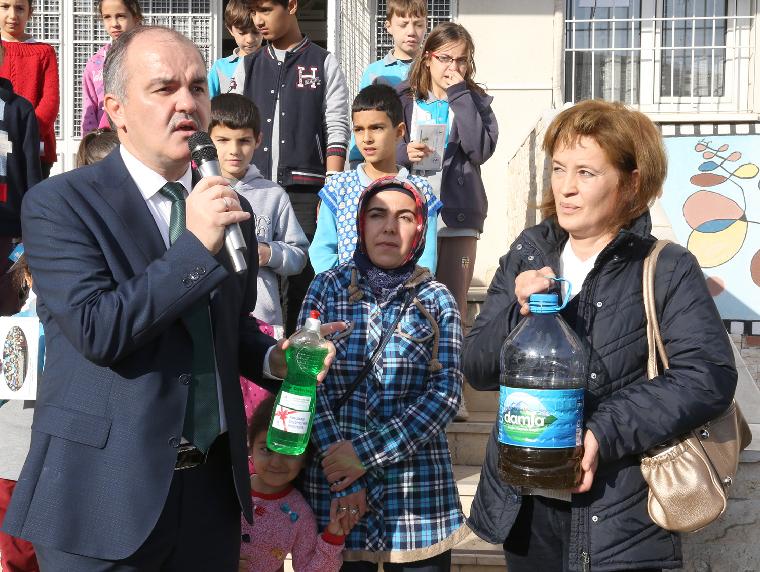 Okulları ziyaret ettiğine Pamukkale Belediye Başkanı Hüseyin Gürlesin, kampanya dahilinde atık yağ toplayan kişiler hediyeler veriyor. Son olarak bir dizi etkinlik için Vakıfbank İlkokulu ve Pınarkent İlkokulu’na giden Başkan Gürlesin, burada atık yağ toplayan kişilere deterjan hediye etti. 1 litrelik bitkisel atık yağın 1 milyon litre suyu kirlettiğini hatırlatan Pamukkale Belediye Başkanı Hüseyin Gürlesin, “Pamukkale Belediyesi olarak çevreye ve doğaya duyarlıyız. Bu bilinçle çevreyi ve doğayı korumak için bir çok projeye imza atıyoruz. Atık yağ toplama projesi de bunlardan biri. Bitkisel atık yağların lavaboya dökülmesi sonucu çevre kirleniyor. Lavaboya dökülen yağlar, kanalizasyon sisteminde tıkamalar dahil bir çok konuda ciddi zararlar veriyor. Sadece Şubat ayından bu yana devam eden atık yağ toplama projemiz sayesinde 6 miyar 100 milyon litre suyun kirlenmesini 6 bin 100 litre atık yağ toplayarak sağladık. Daha çok atık yağ toplayarak suların kirlenmesini önlemiş oluruz. Okullarımız başta olmak üzere mahalle muhtarlıklarımız, restoranlar, yemek firmaları ve otellere atık yağ toplama bidonları koyduk. Bu proje sayesinde Pamukkale Belediyesi çevrenin kirlenmesini de önlemiş oluyor. Vatandaşlarımızın bu konuda duyarlı olmasını rica ediyoruz” dedi. Başkan Gürlesin, öğrencilerin bu konuda bilinçlendirilmesi gerektiğini ifade ederek, “Öğrenciler anne babalarına bu konuyu anlatsınlar. Toplanan atık yağların karşılığında deterjan hediye ediyoruz. Bu küçük gibi görünse de teşvik edici olsun diye yapılan bir uygulama” diye konuştu.