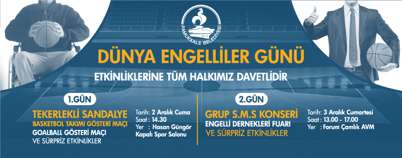 Engellilere yönelik projeler ile dikkat çeken Pamukkale Belediyesi, her yıl olduğu gibi bu yıl da 3 Aralık Dünya Engelliler Günü için özel etkinlik düzenledi. 2 gün olarak planlanan etkinlikler 2 Aralık Cuma günü Hasan Güngör Spor Salonu’nda saat 14.00’te başlayacak. Pamukkale Belediyespor Tekerlekli Sandalye Basketbol takımının gösteri maçının yapılacağı programda goalball gösteri maçı ile birlikte sürpriz etkinlikler gerçekleşecek. 3 Aralık Cumartesi günü ise Pamukkale Belediyesi’nin Dünya Engelliler Günü etkinlikleri Forum Çamlık AVM’de yapılacak. Saat 13.00 ile 17.00 saatleri arasında Grup S.M.S konseri ile başlayacak olan program, engelli derneklerinin katılacağı fuarla devam edecek.