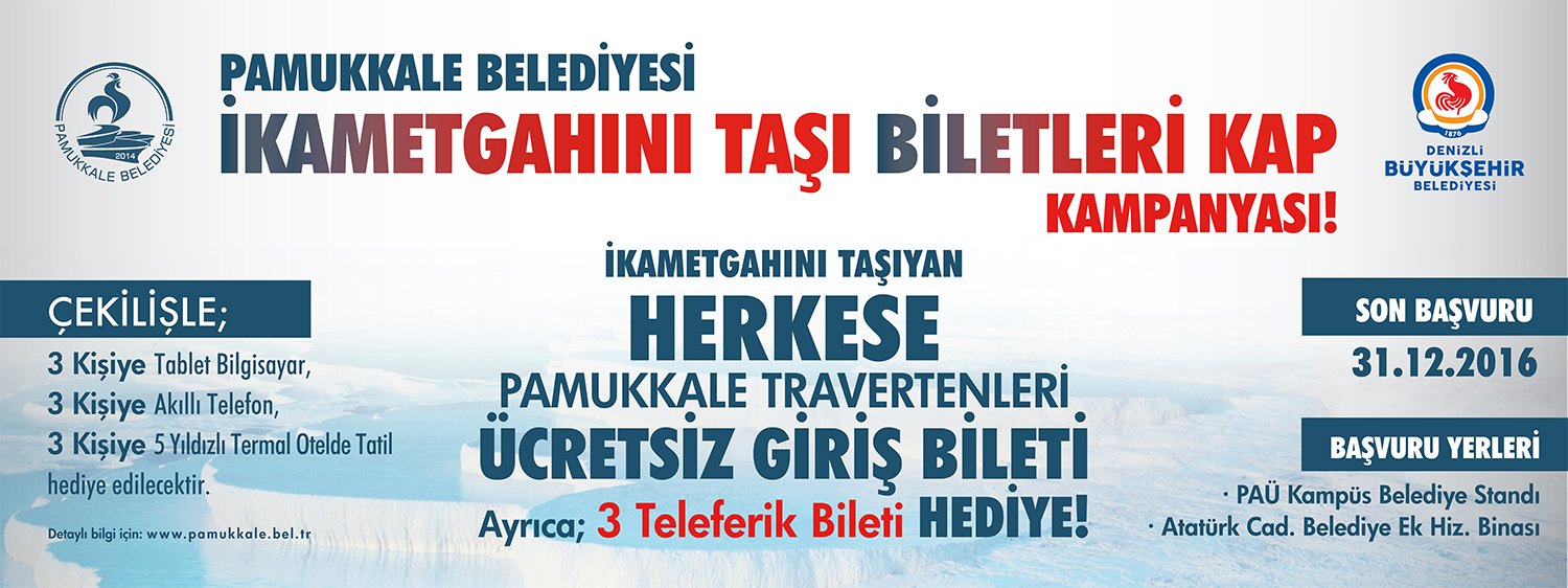 Pamukkale Belediyesi’nin ilkini geçen yıl yaptığı “İkametgâhını Taşı, Bileti kap” kampanyasının ikincisine başvurular başladı. PAÜ’de okuyan öğrencilere yönelik kampanyaya katılan herkese teleferik ve Pamukkale’ye giriş biletinin yanında çekilişle tablet, akıllı telefon ve 5 yıldızlı otelde tatil ödülleri de verilecek. Pamukkale Belediye Başkanı Hüseyin Gürlesin, “Tüm öğrencilerimizi bu kampanyaya katılmaya davet ediyorum” dedi.