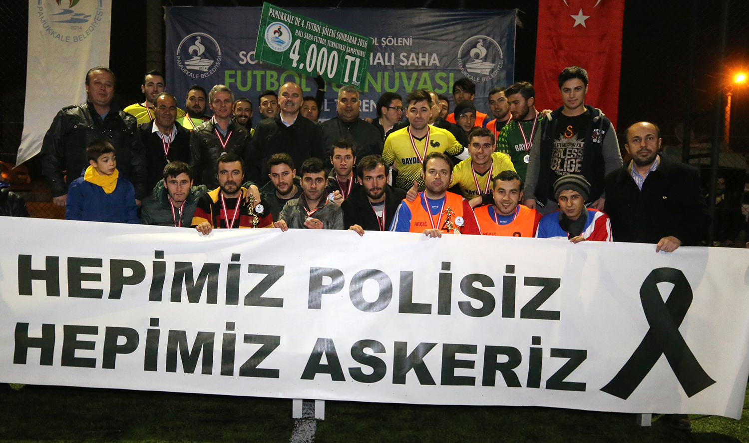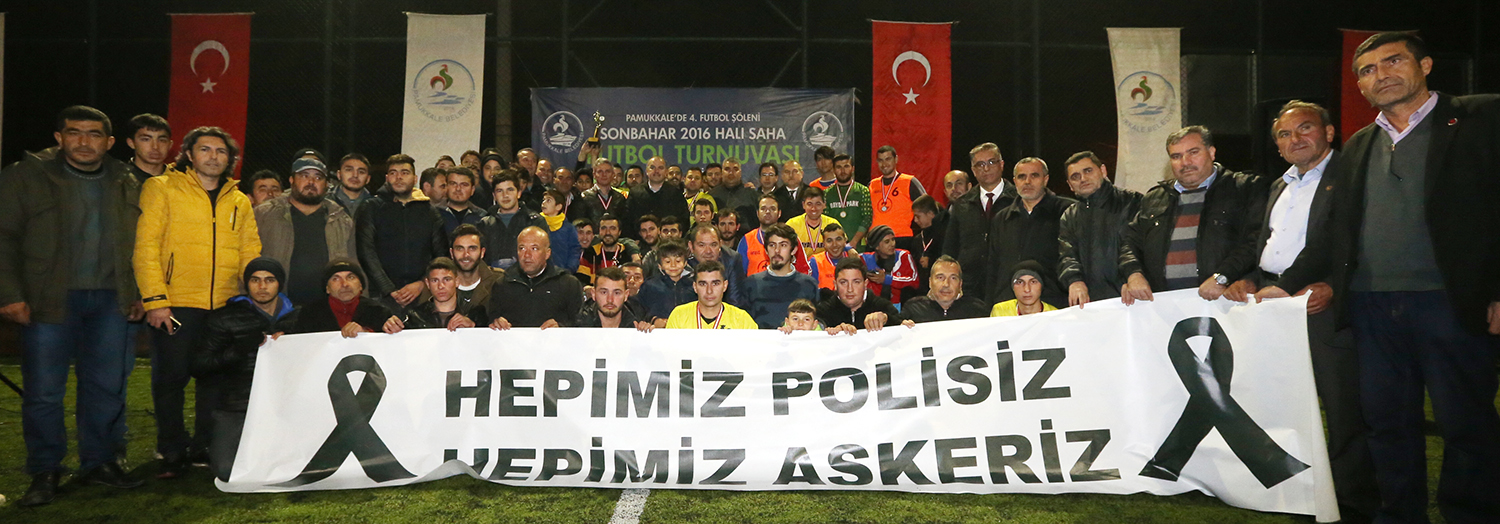 Pamukkale Belediyesi olarak sporun ve sporcunun her zaman yanlarında olduklarını ifade eden Pamukkale Belediye Başkanı Hüseyin Gürlesin, turnuvanın geleneksel hale getirildiğini söyledi. “Amacımız gençlerin kötü alışkanlıklardan uzak kalmasını sağlamak” diyen Başkan Gürlesin, “Biz spor konusunda önemli çalışmalar yapıyoruz. Mahallelerimize halı sahalar yaptık. Bu sahalarda oynana n maçlarla mahalleler arasında kaynaşma sağlamayı amaçladık. İlkini 2015 yılı ilkbaharında yaptığımız turnuvalarımız yılda 2 kez gerçekleşme devam edecek. 4. Futbol şölenimize bu yıl 35 mahalleden 43 takım katıldı. Bu takımlar arasında 3 takım final grubuna kaldı. Bu takımların verdikleri mücadele şampiyonu belirledi. Geçen turnuvada final oynayan Pamukkale mahallemizin takımı bu kez şampiyon oldu. Kaplanlarspor ikinci Çerkez Mahallesi Akköyspor ise üçüncü oldu. Ben katılan tüm takımlarımıza teşekkür ediyor, dereceye giren takımları da kutluyorum. Biz bu turnuvalarımızı devam ettireceğiz. 2017 İlkbahar turnuvamızı da Nisan- Mayıs ayları içinde gerçekleştireceğiz. Biz Pamukkale Belediyesi olarak her zaman sporun ve sporcunun yanında olmaya devam edeceğiz” diye konuştu. Tören sonunda final grubunda yer alan takımların sporcuları dostluk gösterisinde bulundu. “Hepimiz polisiz, hepimiz askeriz” pankartıyla terör de lanetlendi.