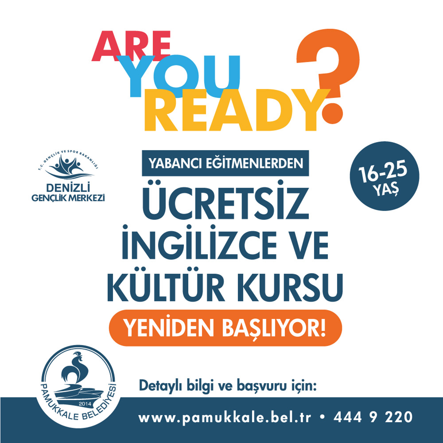 Pamukkale Belediyesi’nin ilkini geçen yılın son aylarında düzenlediği Ücretsiz İngilizce Konuşma Kursları yeniden başlıyor. Kursa katılmak isteyen 16-25 yaş arası gençler müracaatları 16 Ocak 23.59’a kadar internet üzerinden yapabilecekler. Pamukkale Belediye Başkanı Hüseyin Gürlesin, “Gençlerin geleceğe hazırlanmasını bu tür projelerle yardımcı olmaya çalışıyoruz” dedi.