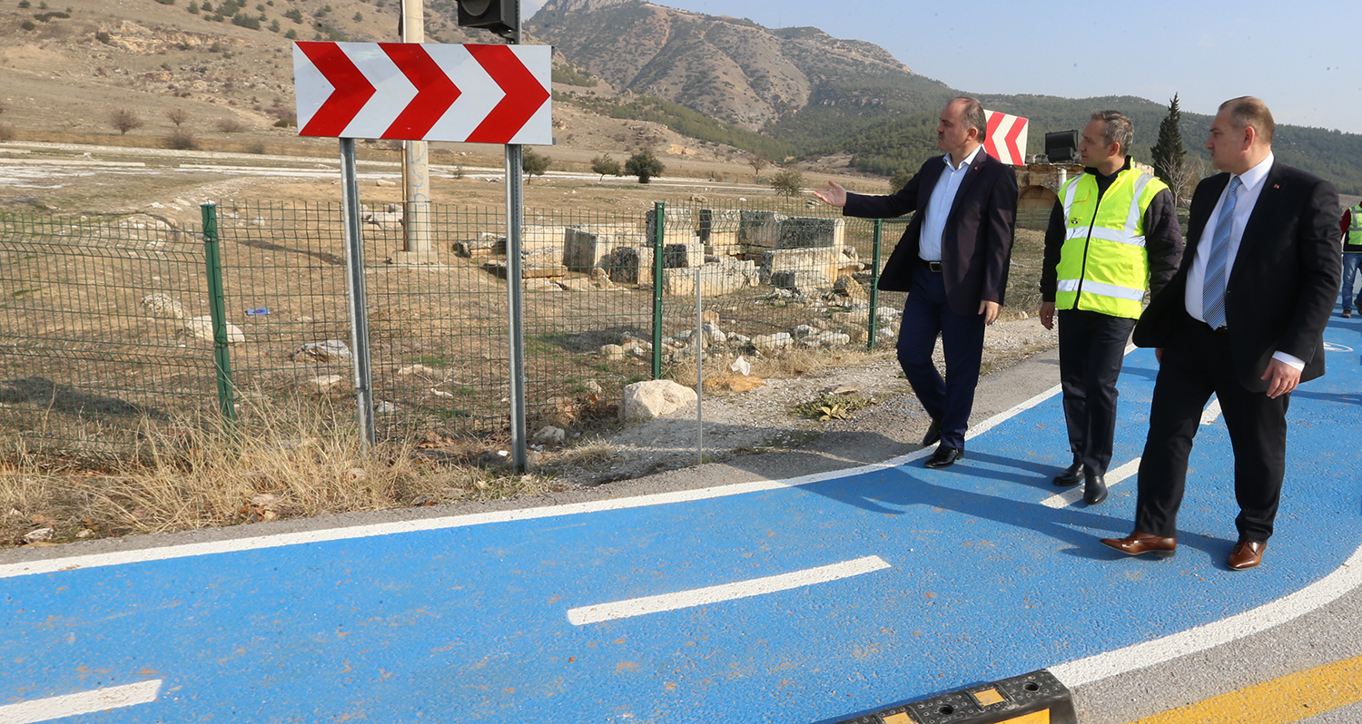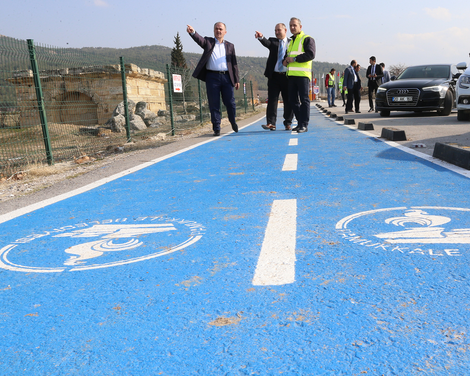 Turizm konusunda bir çok özel proje hazırlığında olan Pamukkale Belediyesi, turizm bölgesinde bisiklet yolu atağına kalktı. Pamukkale-Karahayıt-Akköy’ü kapsayan bölgede Pamukkale Belediyesi Fen İşleri Müdürlüğü ekipleri tarafından bisiklet yolu yapımına devam ediyor. Pamukkale Belediye Başkanı Hüseyin Gürlesin ve Başkan Yardımcısı Adnan Kaya, bölgede yapılan çalışmaları yerinde inceledi. Pamukkale ile Karahayıt arasında bir bölümü yapılan bisiklet yolunu yerinde gören Başkan Gürlesin, ilgililerden bilgiler aldı.