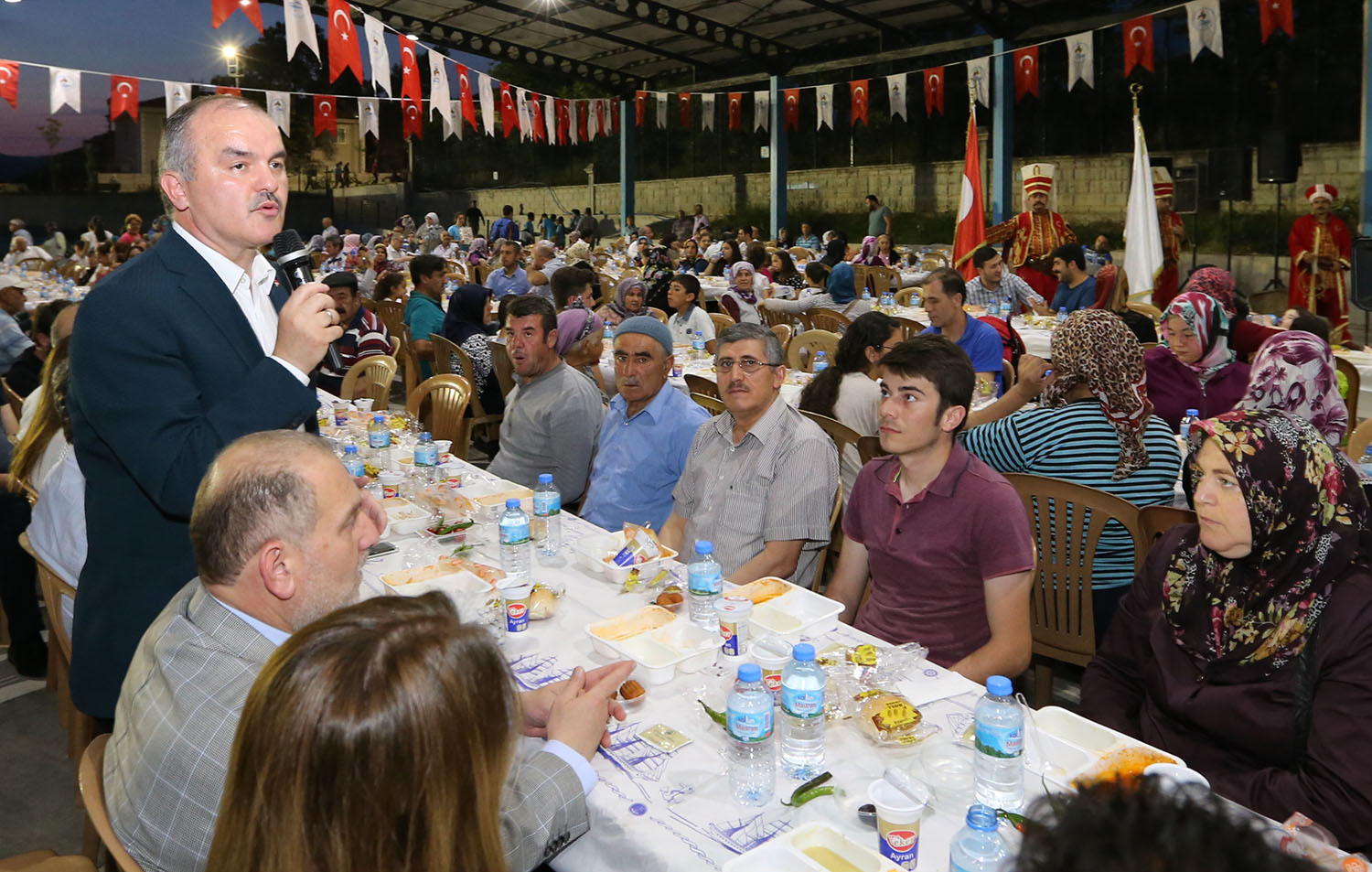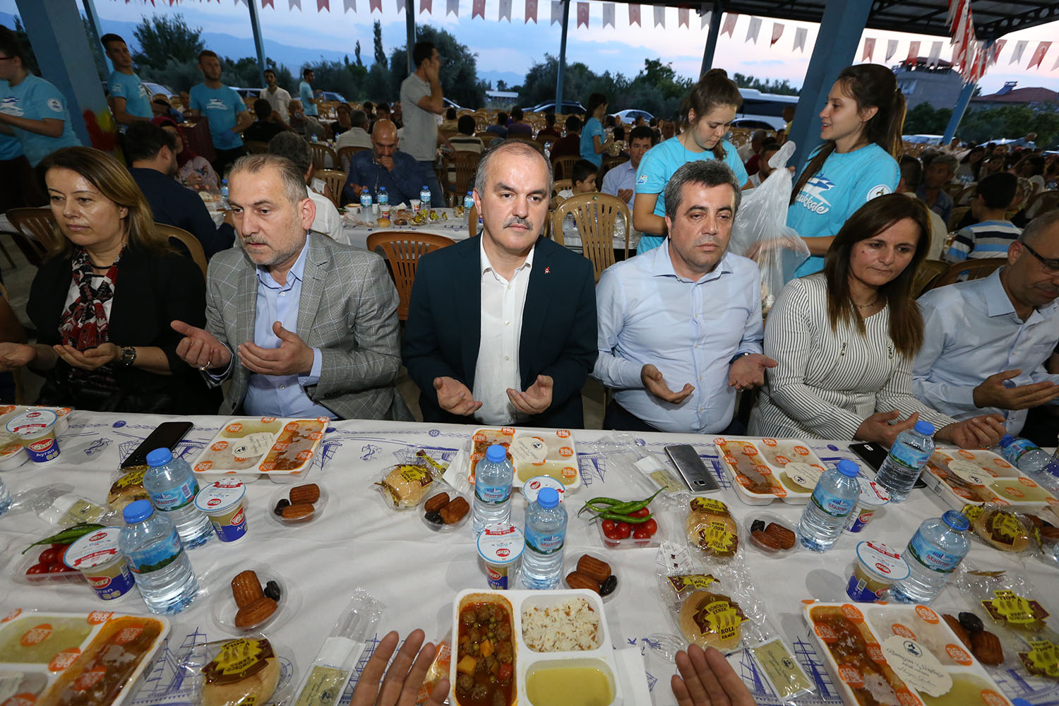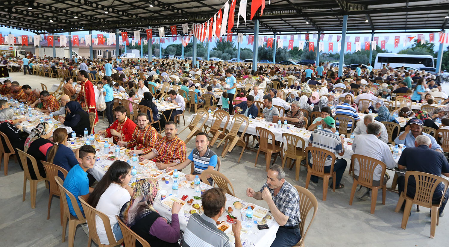 Mübarek Ramazan ayının manevi atmosferini dolu dolu yaşayan Pamukkale Belediyesi, her akşam farklı yerlerde vatandaşlarla iftar sofralarında buluşuyor. Pamukkale Belediyesi tarafından, Akköy Kapalı Pazaryeri’nde verilen yaklaşık 2 bin kişilik iftara, Akköy ve çevre mahalle sakinleri büyük ilgi gösterdi. İftara Pamukkale Belediye Başkanı Hüseyin Gürlesin, Başkan Yardımcısı Adnan Kaya, Ak Parti Pamukkale İlçe Başkanı Hasan Aracı, Ak Parti Pamukkale İlçe Kadın Kolları Başkanı Halise Akar katıldı. İftara katılan tüm vatandaşlarla tek tek ilgilenerek hal hatırlarını soran Pamukkale Belediye Başkanı Hüseyin Gürlesin’e halkın ilgisi de büyük oldu. Ezanın okunması ile birlikte duaların ardından yaklaşık 2 bin kişi bir sofrada oruçlarını açtılar.