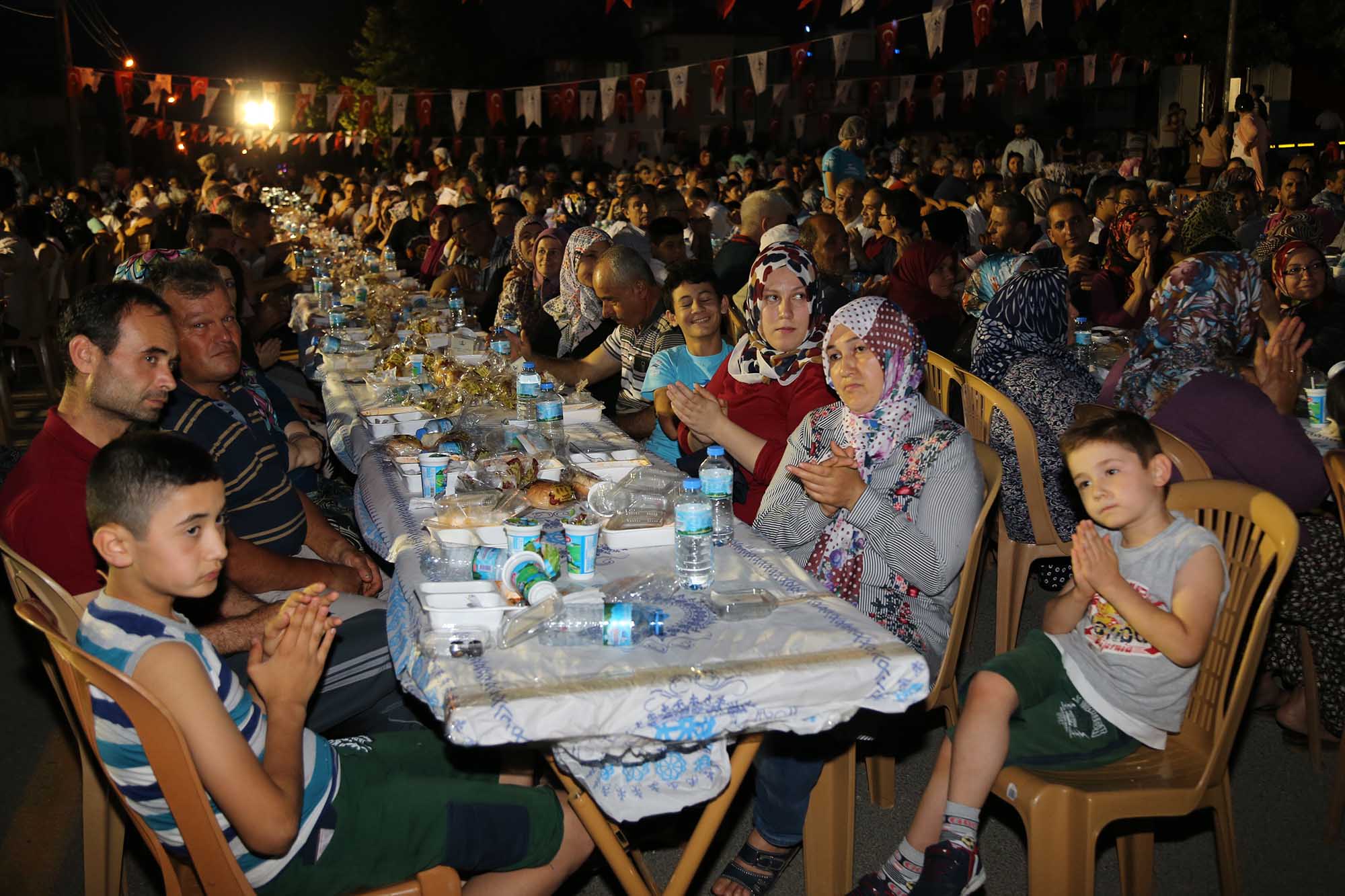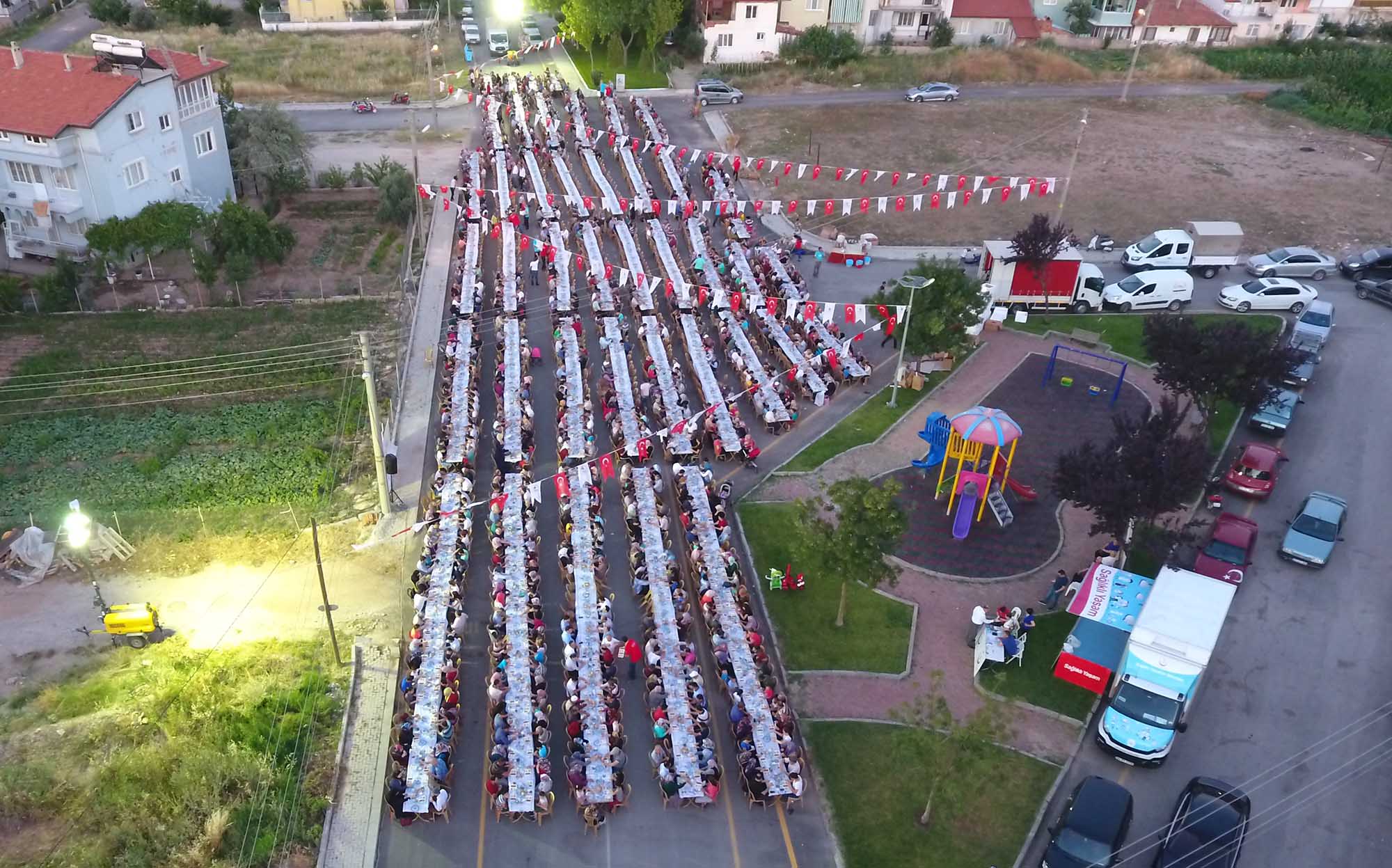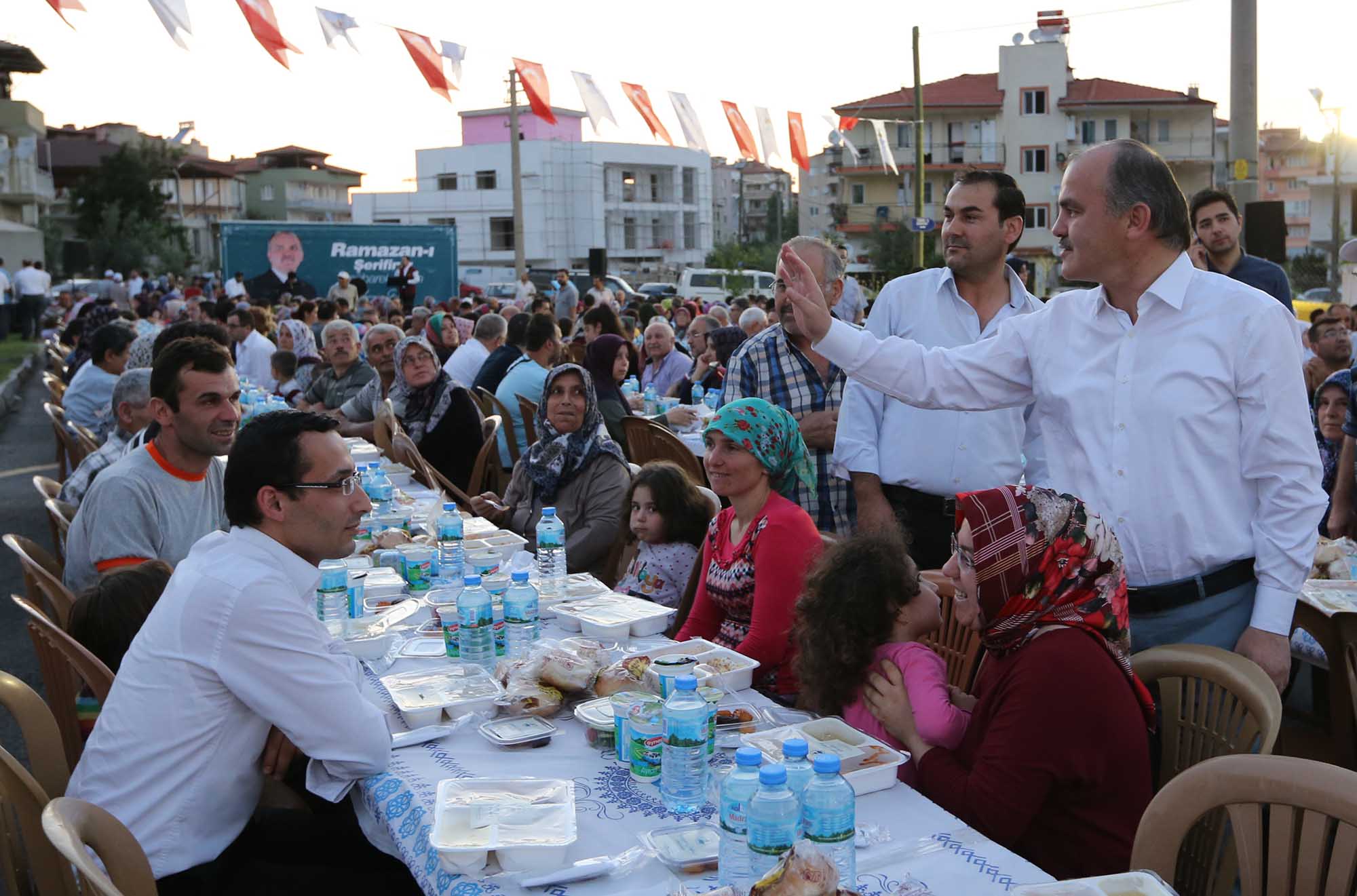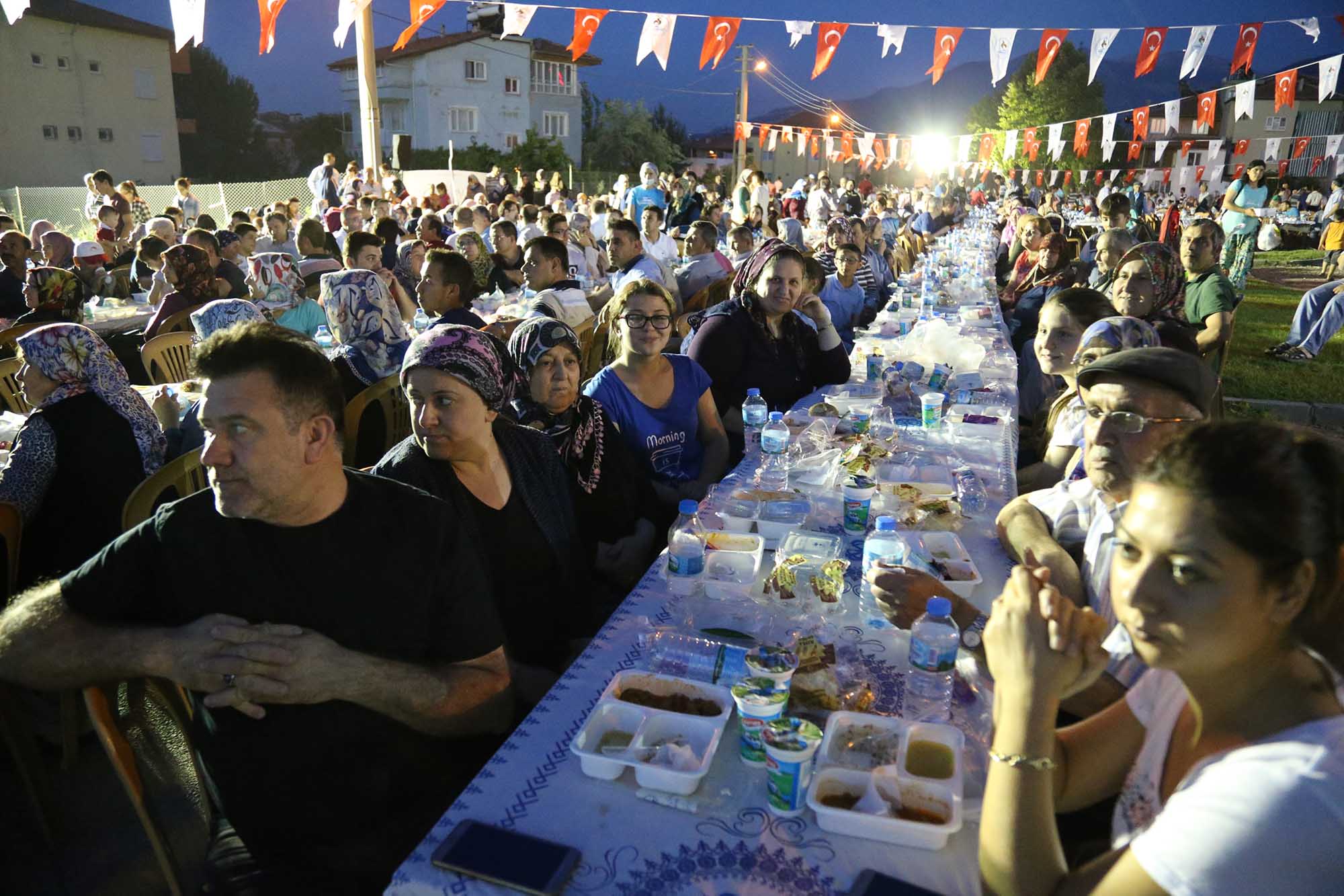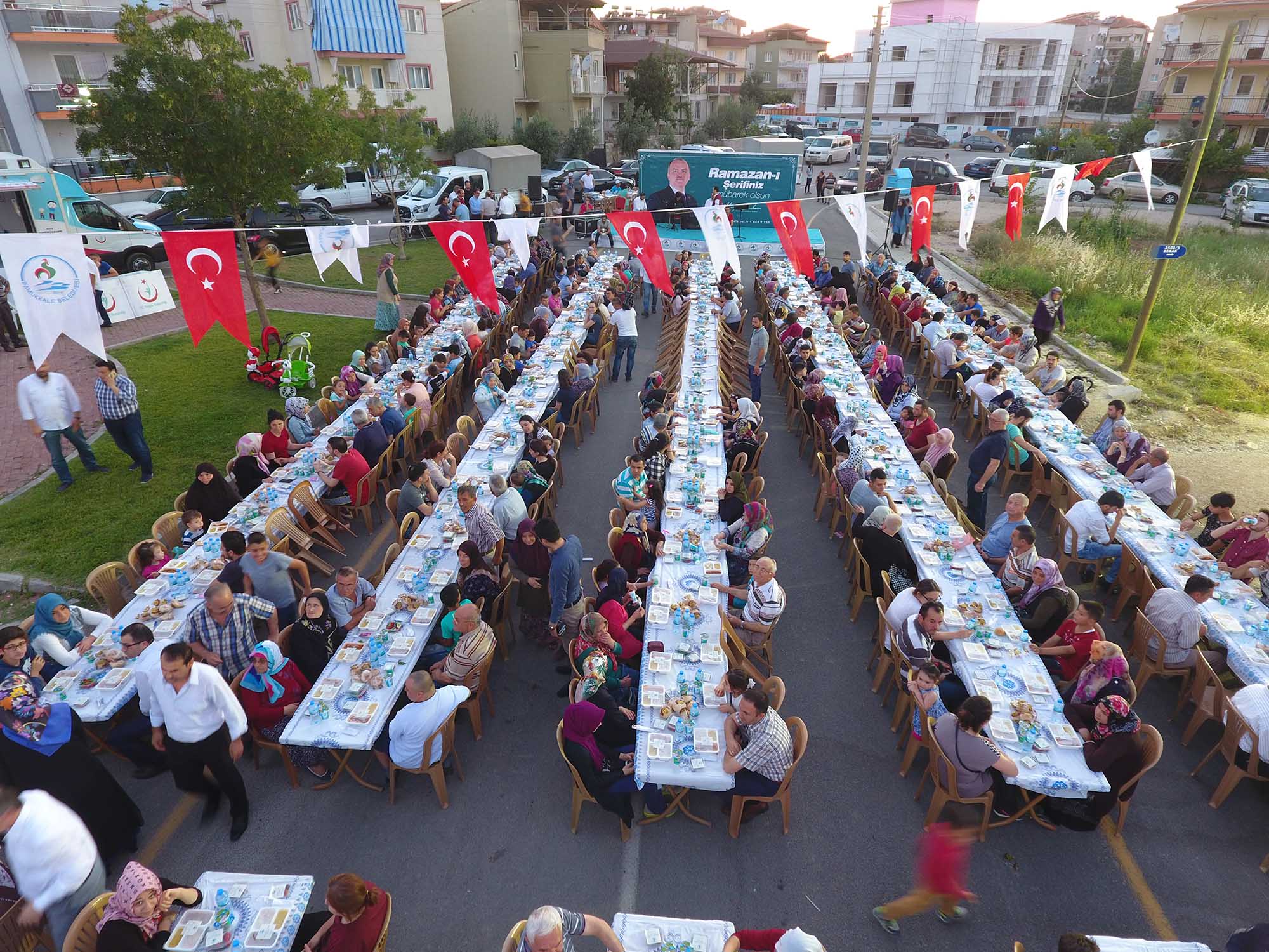 Pamukkale’de mübarek Ramazan ayı dolu dolu yaşandı. Pamukkale Belediye Başkanı Hüseyin Gürlesin her gün farklı mahallede iftar sofralarında ve sahurlarda halkın her kesimiyle bir araya geldi. Başkan Gürlesin kimi zaman iftarlarda halkla buluşurken, yurtlarda kalan erkek öğrencilerle sahurda, kız öğrencilerle de iftarda buluştu. Ramazan ayı boyunca, her akşam farklı yerlerde iftar sofralarında vatandaşlarla bir araya gelen Pamukkale Belediye Başkanı Hüseyin Gürlesin, son iftarını Cumhuriyet Mahallesi’nde oturan vatandaşlarla yaptı. Yaklaşık 2 bin kişinin katıldığı iftar yemeğinden önce Başkan Gürlesin, masaları tek tek gezerek mahalle sakinleriyle sohbet edip, hal hatırlarını sordu. Pamukkale Belediyesi tarafından, Cumhuriyet Mahallesi’nde verilen iftara, Pamukkale Belediye Başkanı Hüseyin Gürlesin, Başkan Yardımcıları Selim Arkan ve Adnan Kaya, Türkay Gözlükaya, Veli Demir, Abdullah Sevinçli ve Cumhuriyet Mahallesi ile çevre mahalle sakinleri de katıldı.
