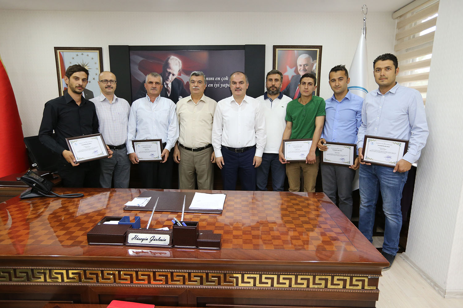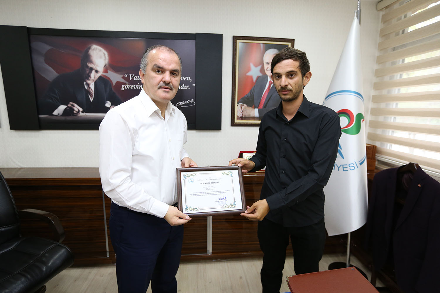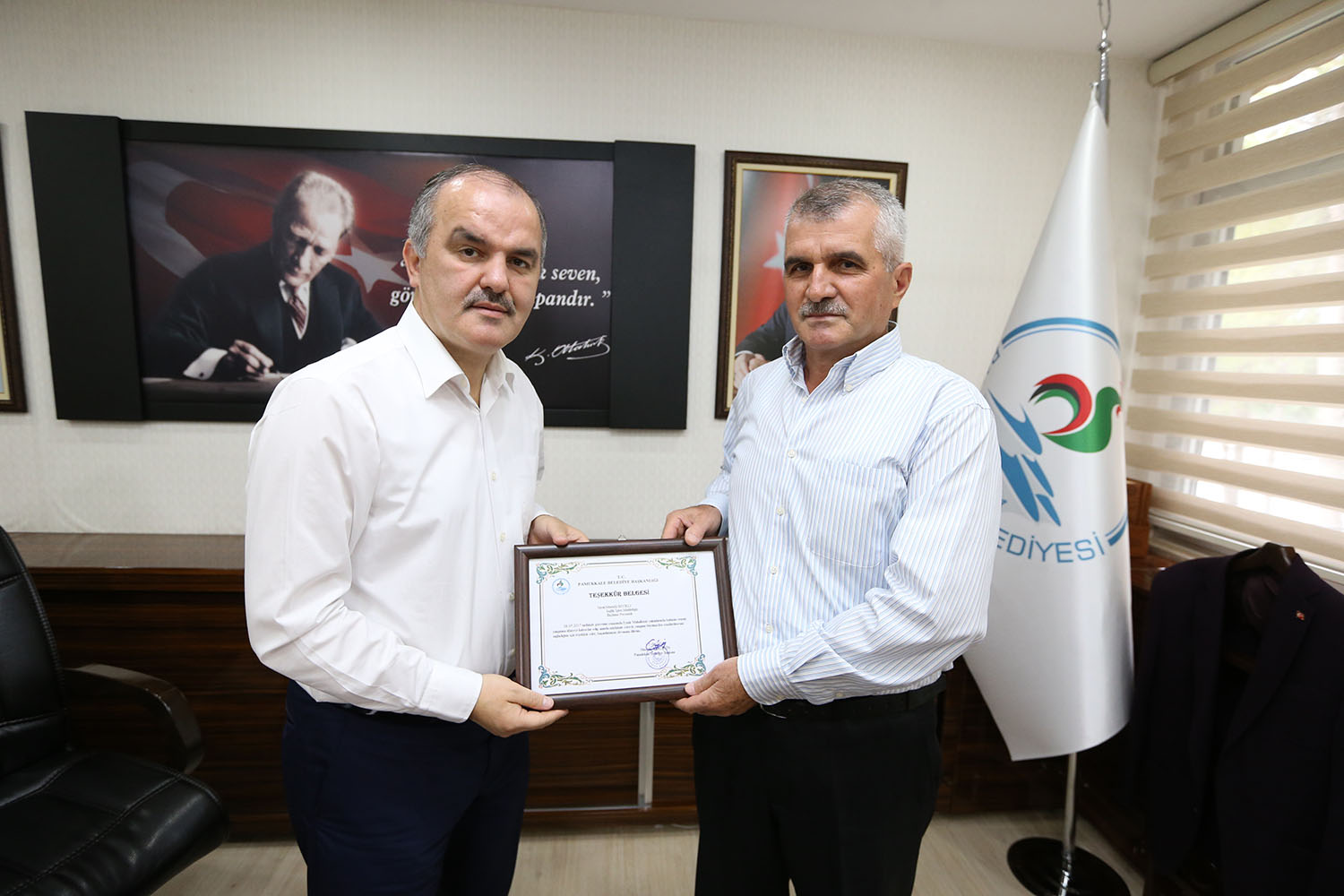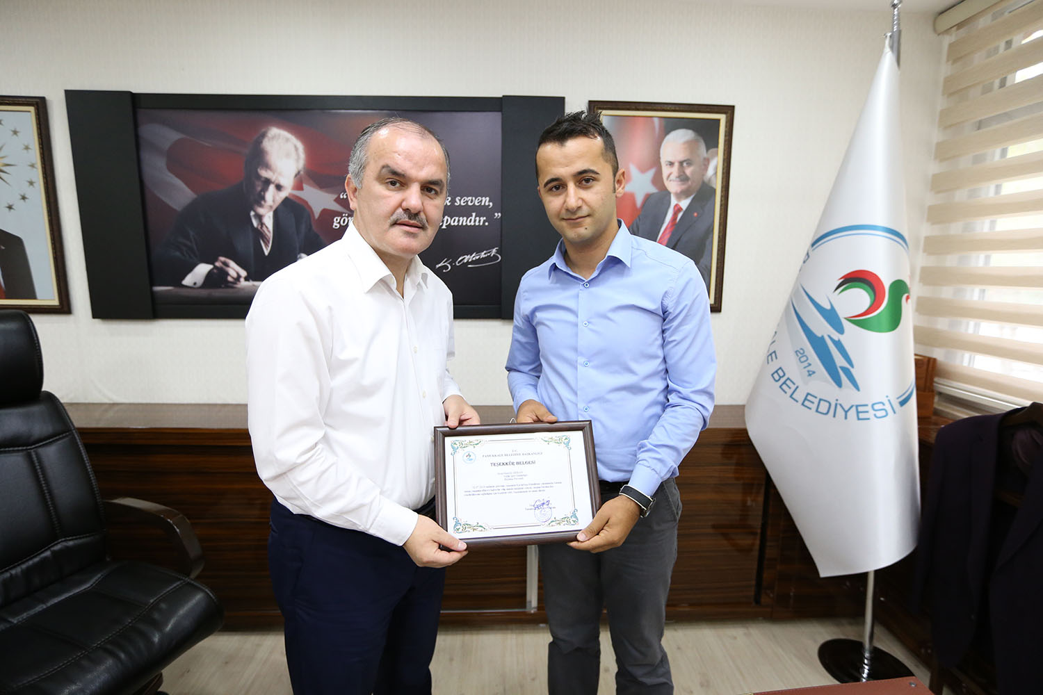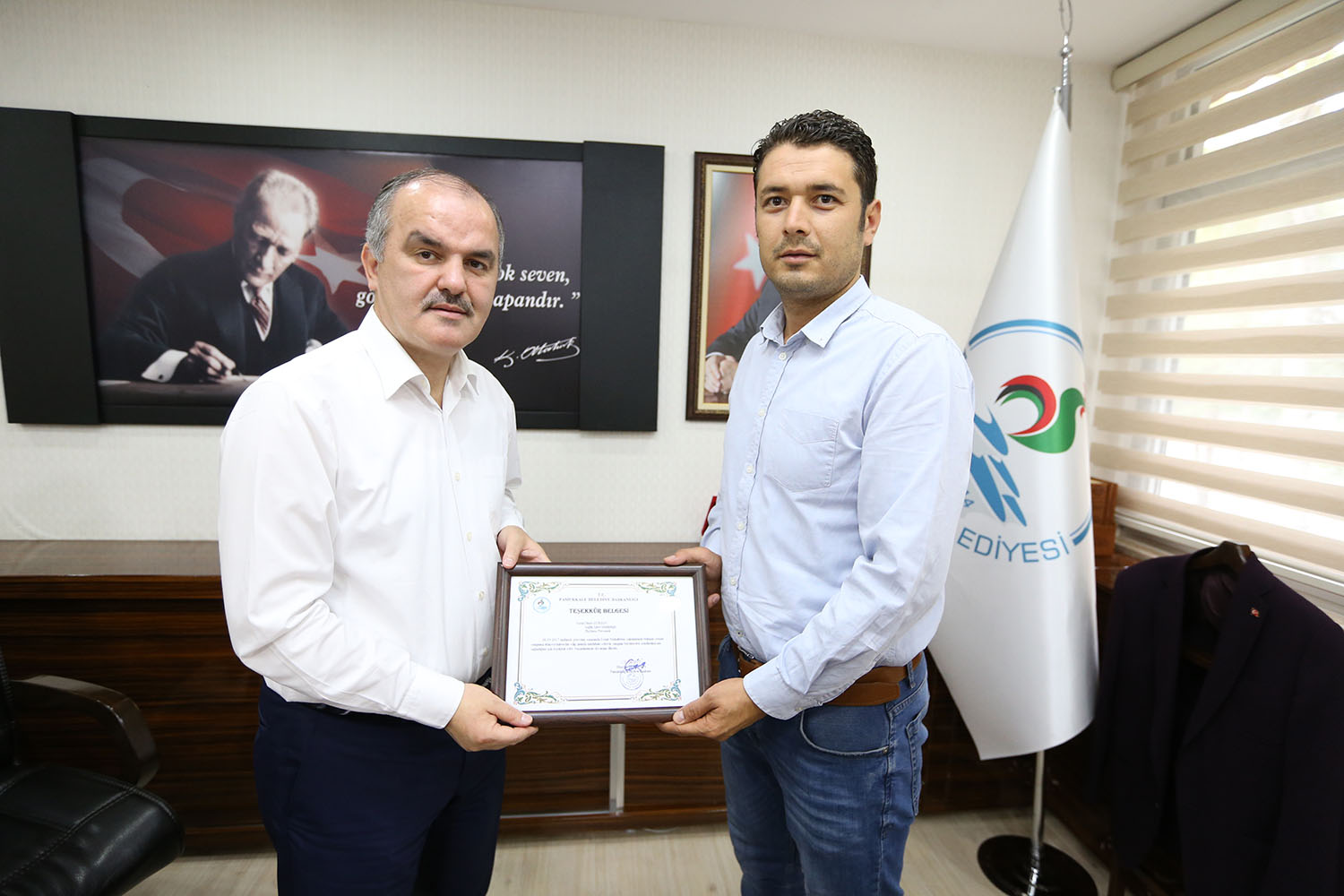 Pamukkale Belediye Başkanı Hüseyin Gürlesin, geçtiğimiz ay görev dönüşü Eymir yakınlarında fark ettikleri orman yangınına müdahale ederek, binlerce dekarlık ormanı kül olmaktan kurtaran belediyenin personellerine teşekkür belgesi taktim etti. Başkan Gürlesin, “Arkadaşlarımız büyük bir fedakarlık yaparak canları pahasına zor imkanlarla binlerce dekarlık ormanı kül olmaktan kurtardı. Onların bu davranışı bizi çok gururlandırdı. Hepsine ayrı ayrı teşekkür ediyorum” dedi.