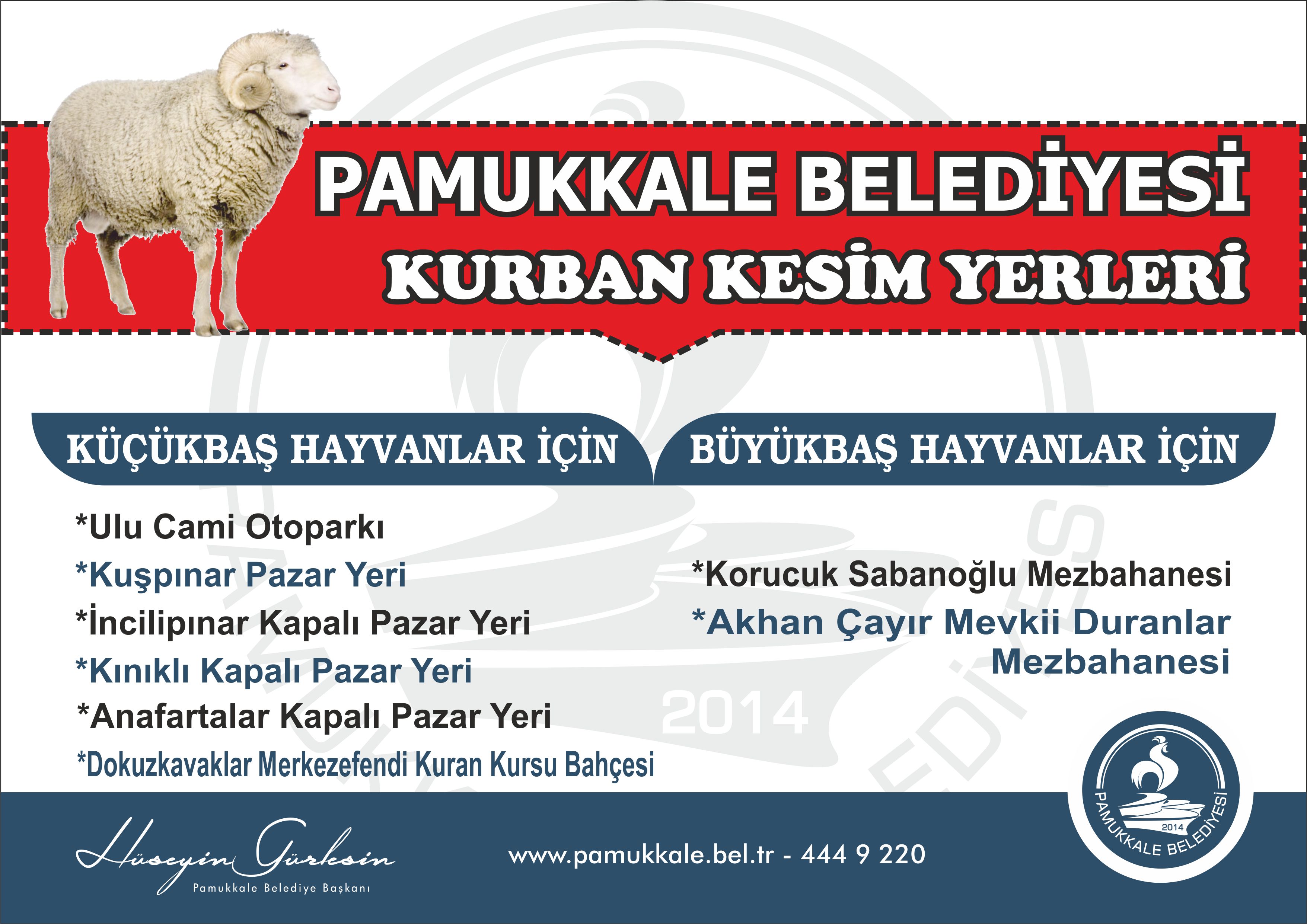 Pamukkale Belediyesi’nden yapılan yazılı açıklamada, bayram hazırlıkları çerçevesinde belediyelerce hayvan sağlığı ve halk sağlığı ile ilgili alınması gereken tüm tedbirlerin alındığı ifade edildi. Açıklamada, ayrıca ilçedeki kurban kesim yerleri açıklandı. Buna göre, küçükbaş hayvanlar için kurban kesim noktaları Ulu Cami otoparkı, Kuşpınar Pazaryeri; İncilipınar kapalı Pazaryeri; Kınıklı kapalı Pazaryeri; Dokuzkavaklar Merkezefendi Kuran Kursu Bahçesi; Anafartalar Kapalı Pazaryeri olarak açıklandı. Büyükbaş hayvanlar için ise Korucuk’taki Sabanoğlu Mezbahanesi ve Akhan’da Çayır Mevkii Duranlar Mezbahanesi olduğu belirtildi.
