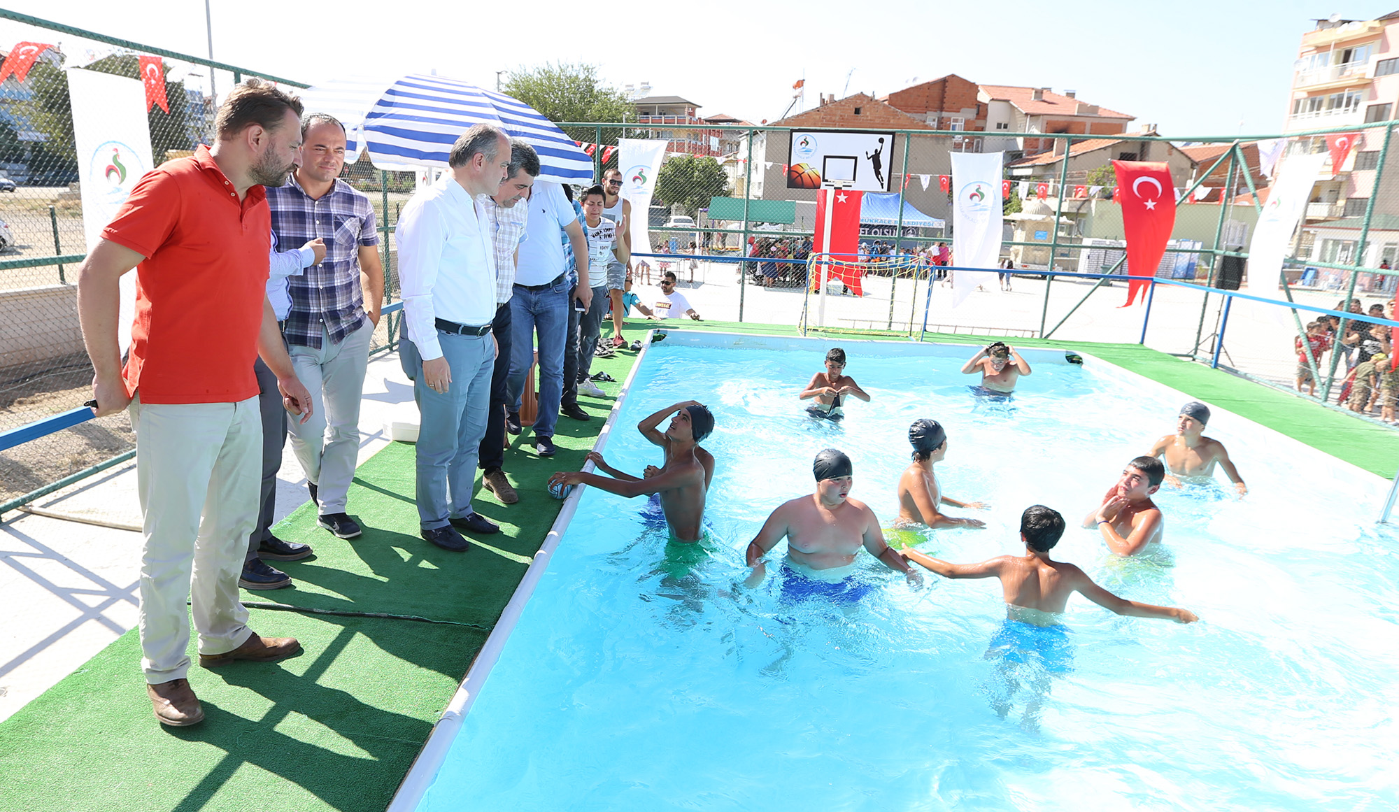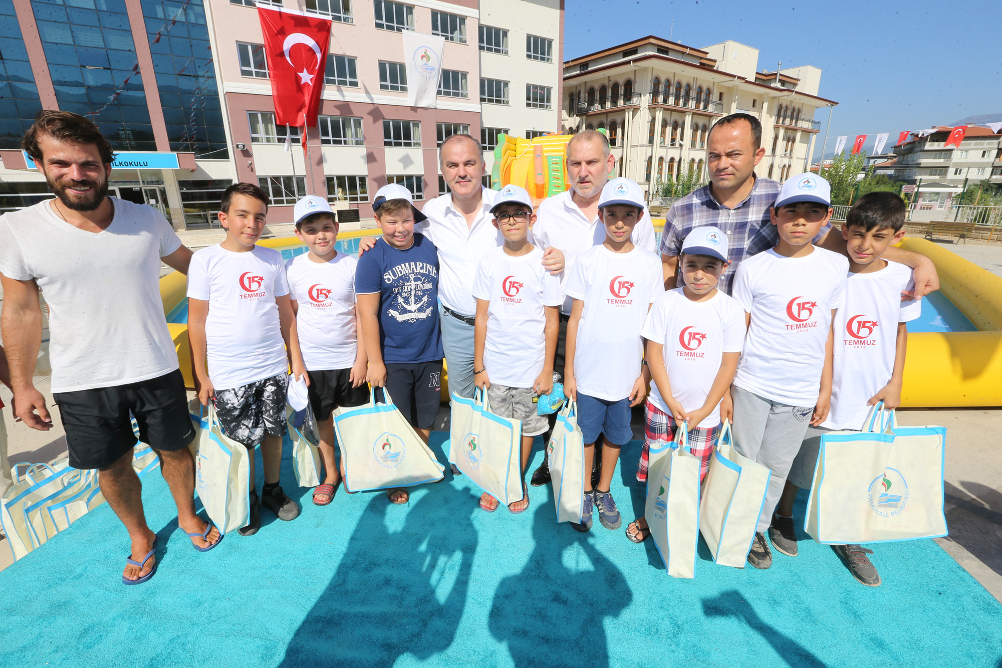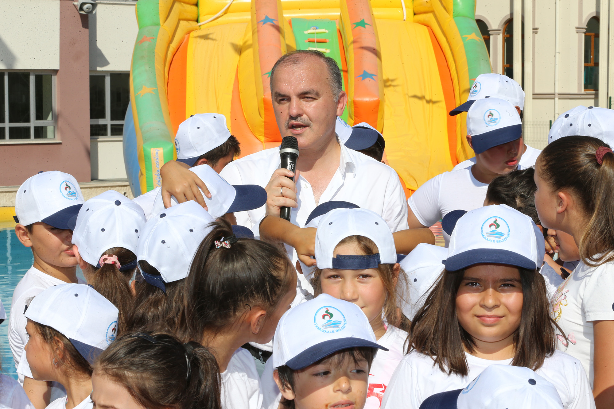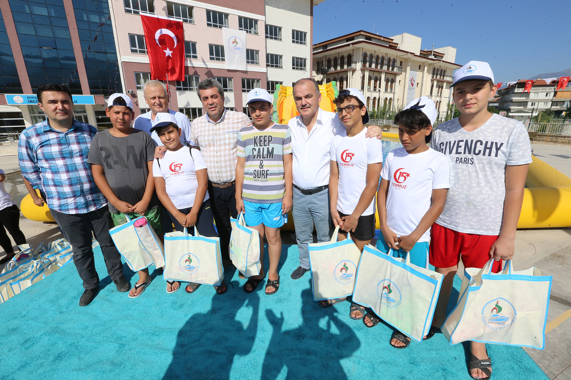 Pamukkale Belediyesi’nin ilçe sınırları içinde yer alan öğrenciler ya hediyesi olarak sunduğu yüzme kurusunun finali yapıldı. Yüzlerce öğrencinin hem eğlenip hem de yüzme öğrendiği yüzme kurslarının finali su topu turnuvasıyla tamamlandı. Aktepe grubunun birinci olduğu final sonunda katılan çocuklara çeşitli hediyeler verildi. Pamukkale Belediye Başkanı Hüseyin Gürlesin, öğrencilere yaz tatili hediyesi olarak yüzme kursu verildiğini ifade ederek, “Binlerce çocuğumuz bu kurslarda yüzme öğrendi. Bu tür etkinliklerimiz her yaz devam edecek” dedi.