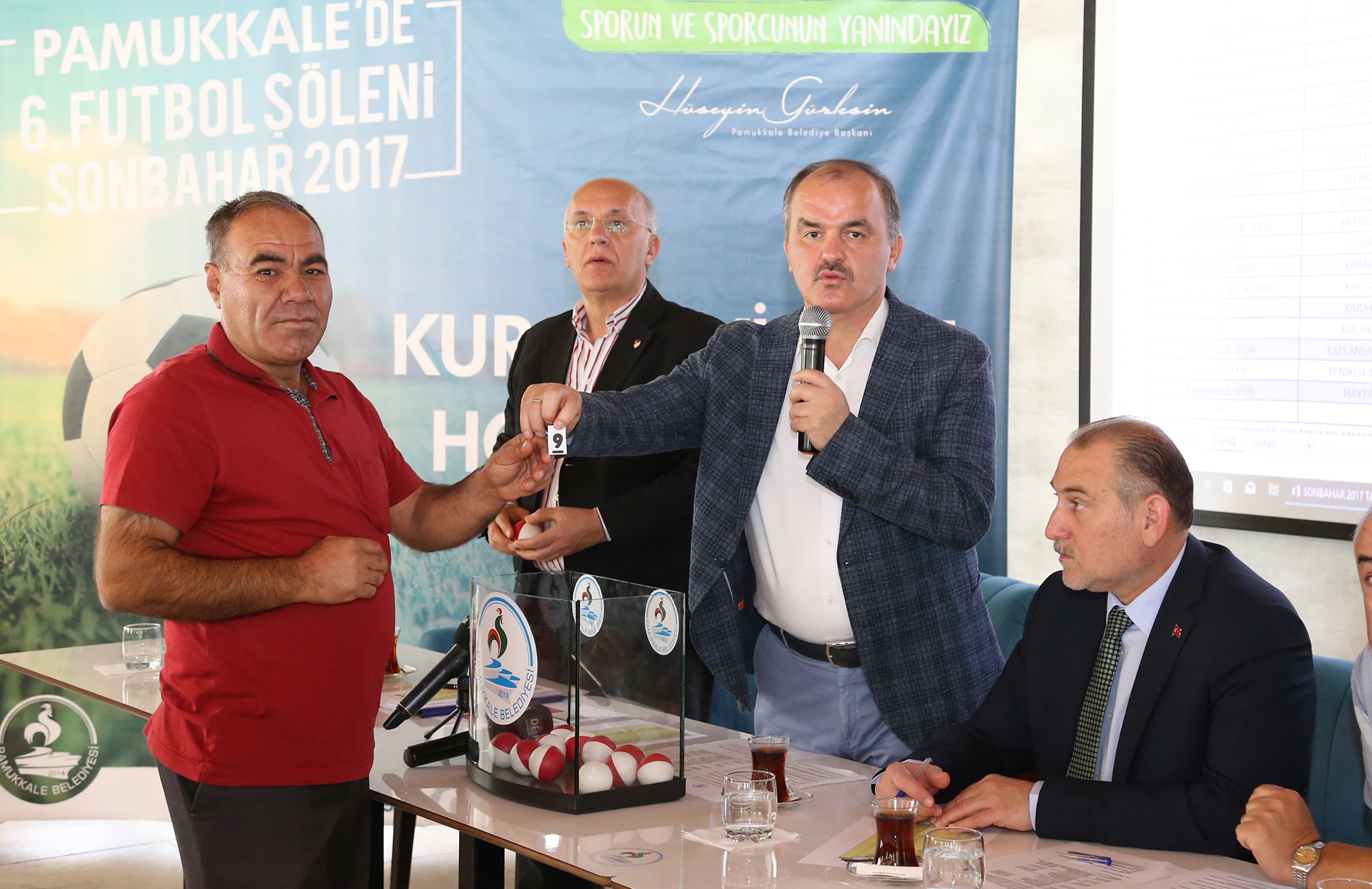Kura çekiminden önce açıklamalarda bulunan Pamukkale Belediye Başkanı Hüseyin Gürlesin, “Her yıl 2 kez düzenlediğimiz halı saha futbol turnuvamızın altıncısının kura çekimi için bir aradayız. Geleneksel hale getirdiğimiz turnuvamızın amacı mahalleler arasında kaynaşmayı sağlamak. Aynı zamanda ilçe genelinde belediyemiz tarafından yaptırılan halı sahaların aktif halde kullanılmasını da istiyoruz. Sonbahar 2017 turnuvamıza 31 mahalleden 40 takım katıldı. Yaklaşık 1 ay sürecek olan turnuvamıza katılan tüm takımlara başarılar dilerim” dedi.