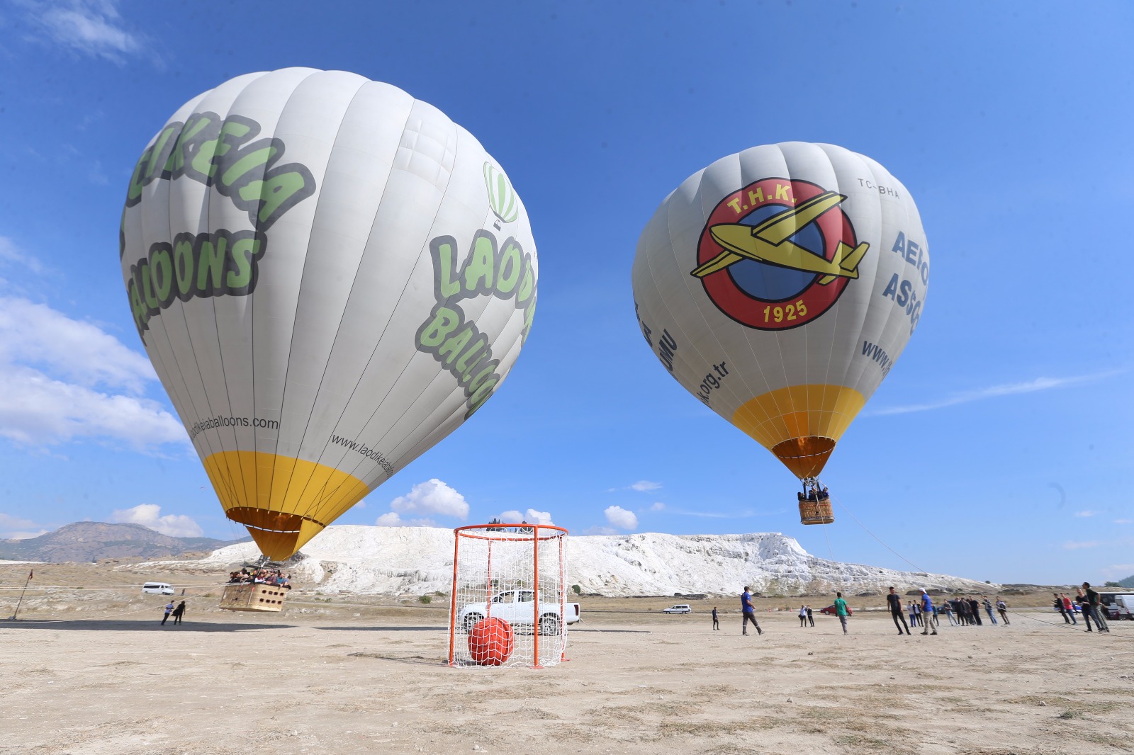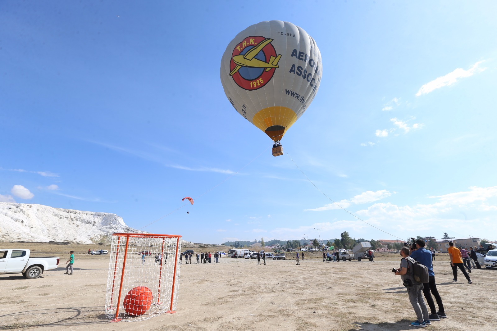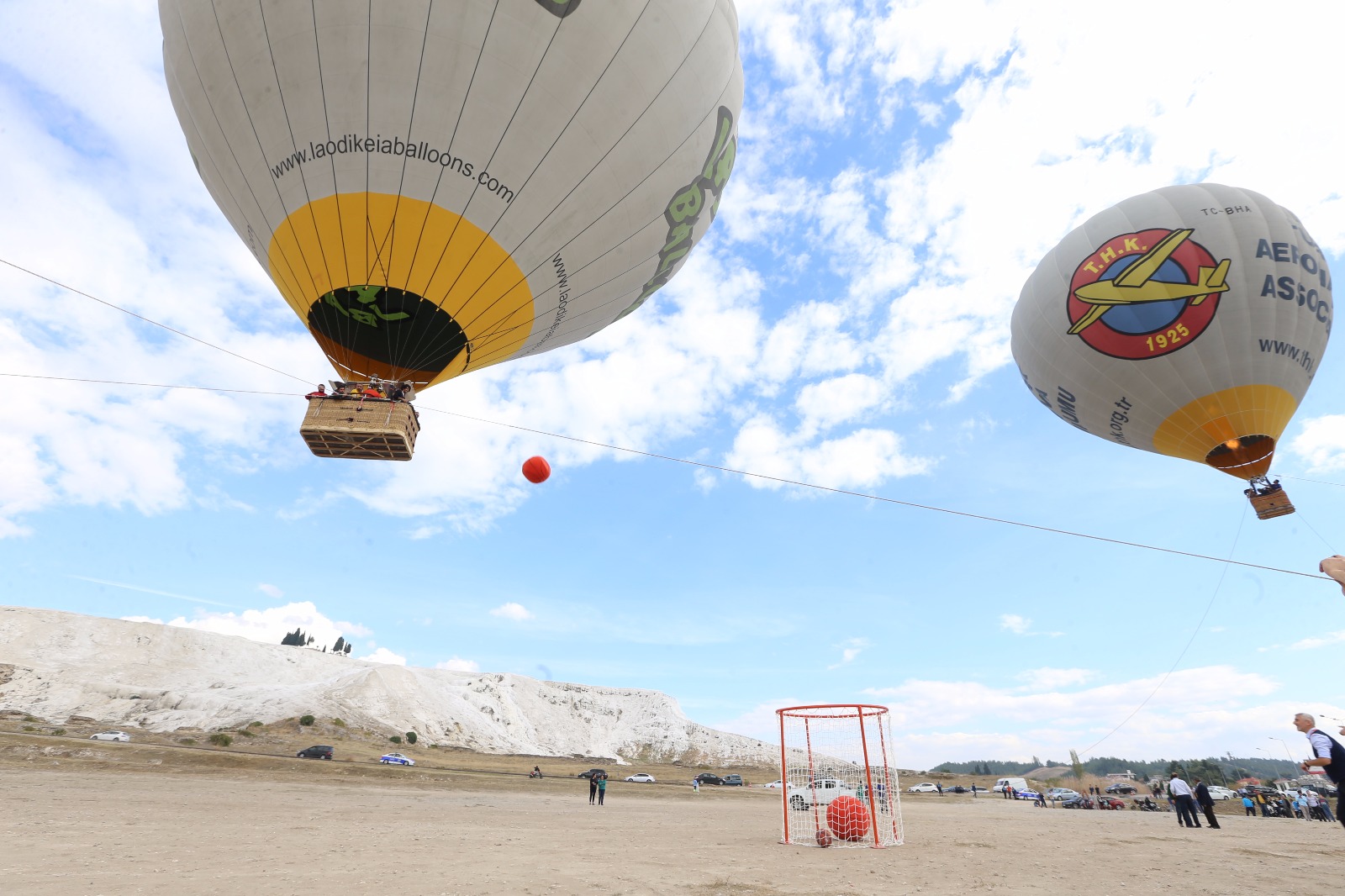 Pamukkale Belediyesi’nin dev organizasyonu Pamukkale Spor Oyunları tüm hızıyla devam ediyor. 3x3 Dünya Mirasları Turnuvası kapsamında sporcular Pamukkale travertenleri önünde balona binerek dev potalara basket attılar.
