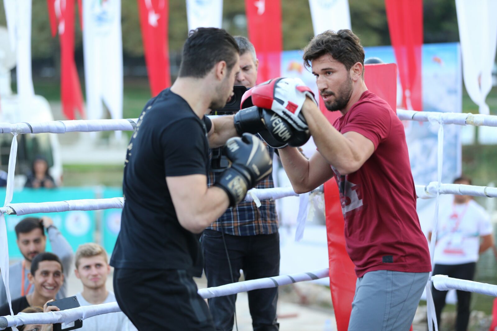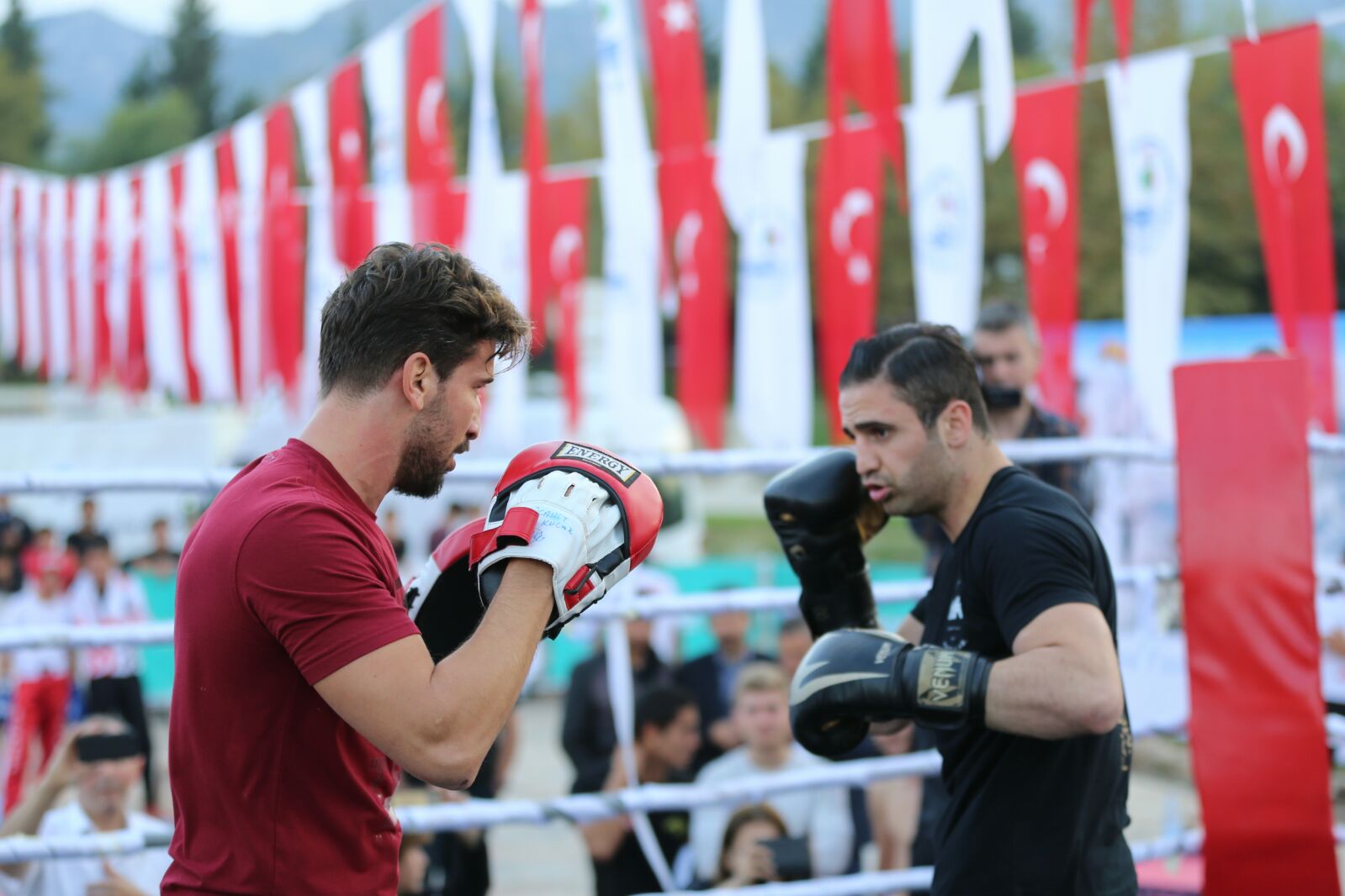 Sporseverlerin büyük ilgi gösterdiği gösteri maçı öncesi konuşan Milli Boksör Adem Kılıççı, Türk sporuna bu tür bir organizasyonla destek veren Pamukkale Belediye Başkanı Hüseyin Gürlesin’e teşekkür ederek, “Gerçekten sayın başkan çok önemli bir işe imza attı. Sporun yaygınlaştırılması için bu ve benzeri etkinlikler çok önemli. 3 gün süren bu etkinlikler sayesinde genlerin sporu sevmesi ve başlaması sağlanabilir. Biz de gençlere iyi örnek olmak için çalışıyoruz. Bizi Denizli halkıyla buluşturan Pamukkale Belediye Başkanı Hüseyin Gürlesin’e boks sporunun tanıtımına katkı verdiği için bir kez daha teşekkür ederim” dedi. Milli kick bokscu Mücahit Kulak ise sporun önemli olduğunu ifade ederek, “Biz milli sporcular olarak Türk bayrağını göndere çıkarmak için çalışıyoruz. Bu sporun tanıtımı bu tür etkinliklerle olur. Bize bu imkanı sağlayan sayın başkanımız Hüseyin Gürlesin’e teşekkür ederim” dedi. İki sporcu daha sonra boks ve kick boks branşının figürleirni sergiledikleri gösteri maçına geçildi. Sporseverler bu maçta iki milli sporcuyu izleme imkanı buldular.